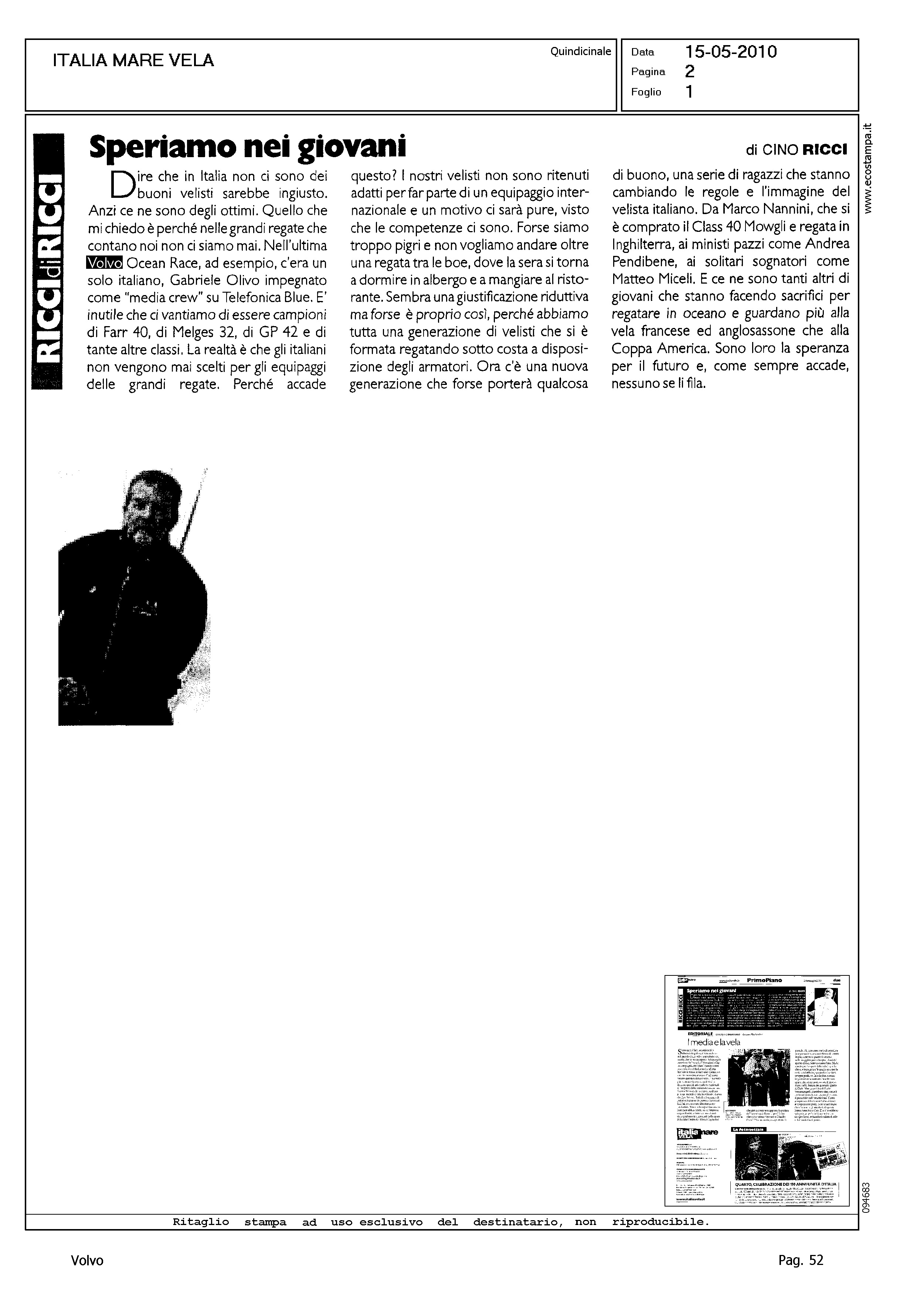 Author: RICCI, CINOLine: Corporate Model: Corporate Subject: Volvo Ocean Race Title: SPERIAMO NEI GIOVANIHighlight: GLI ITALIANI NELLA VOR