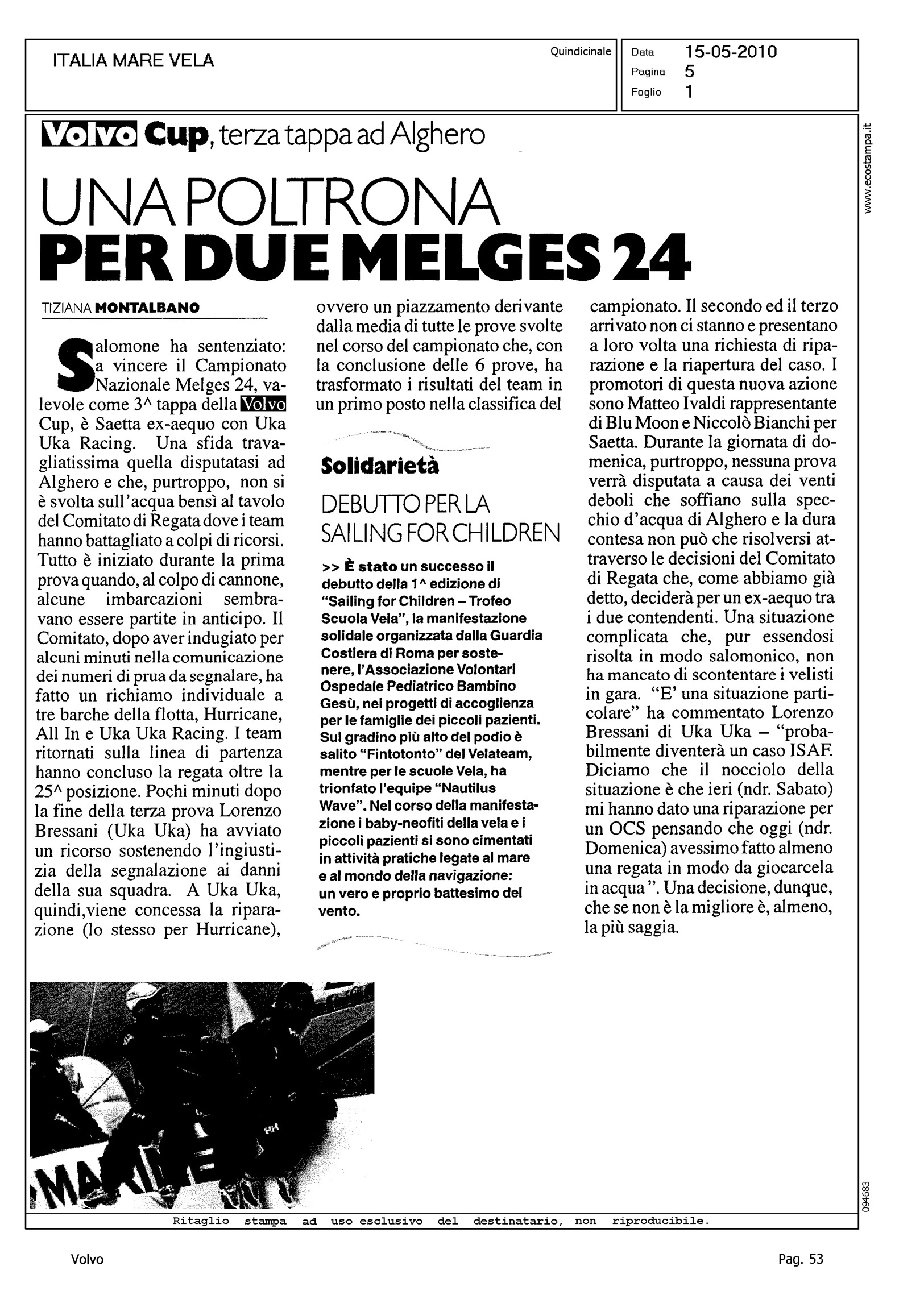 Author: MONTALBANO, TIZIANALine: Corporate Model: Corporate Subject: Volvo Cup Title: UNA POLTRONA PER DUE MELGES 24Highlight: REGATA DI ALGHERO