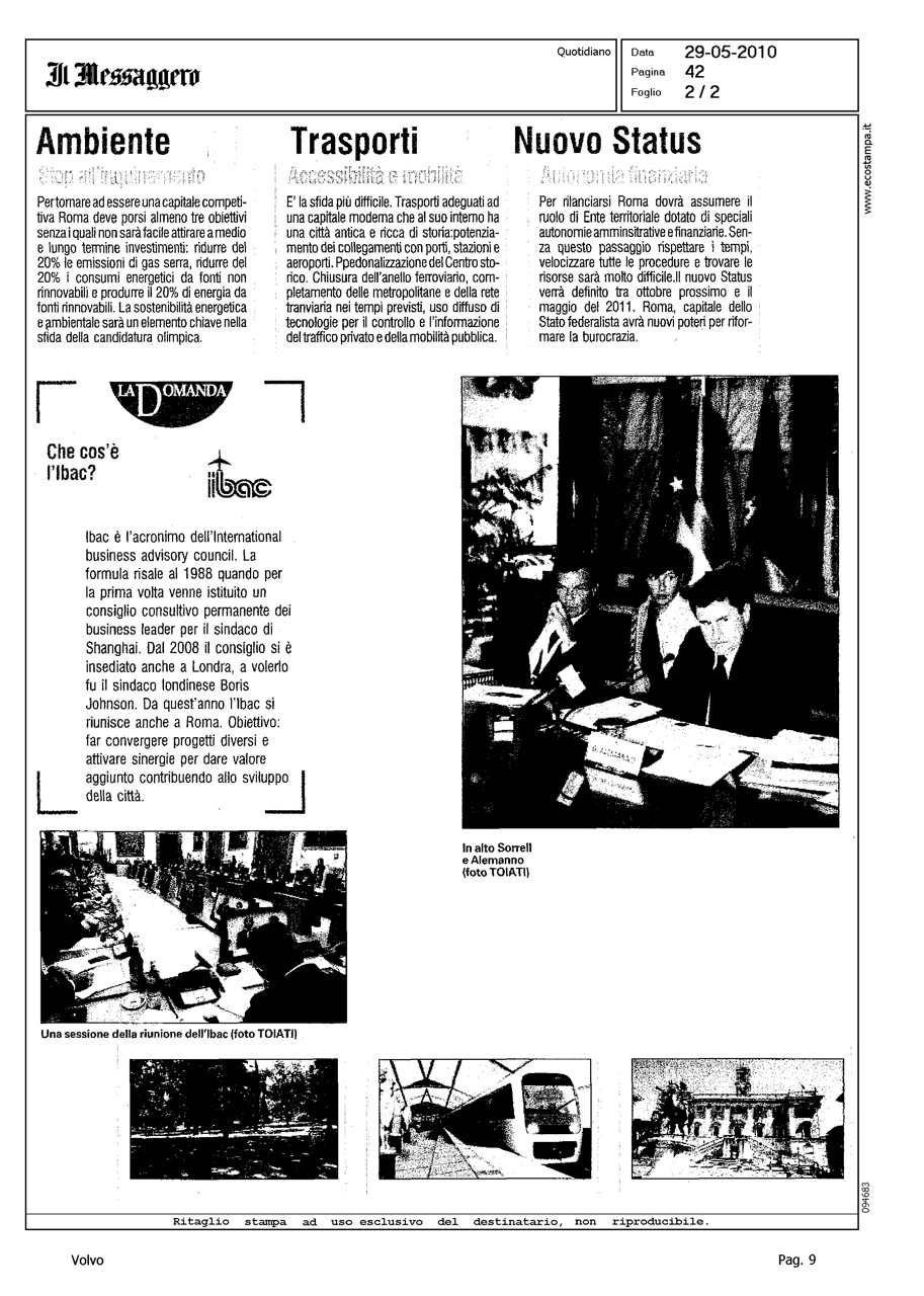 Author: MARINCOLA, CLAUDIOLine: Corporate Model: Corporate Subject: - Title: IL GOTHA DELL'ECONOMIA MONDIALE STUDIA COME FARE BUSINESS A ROMAHighlight: IBAC ROMA, VOLVO