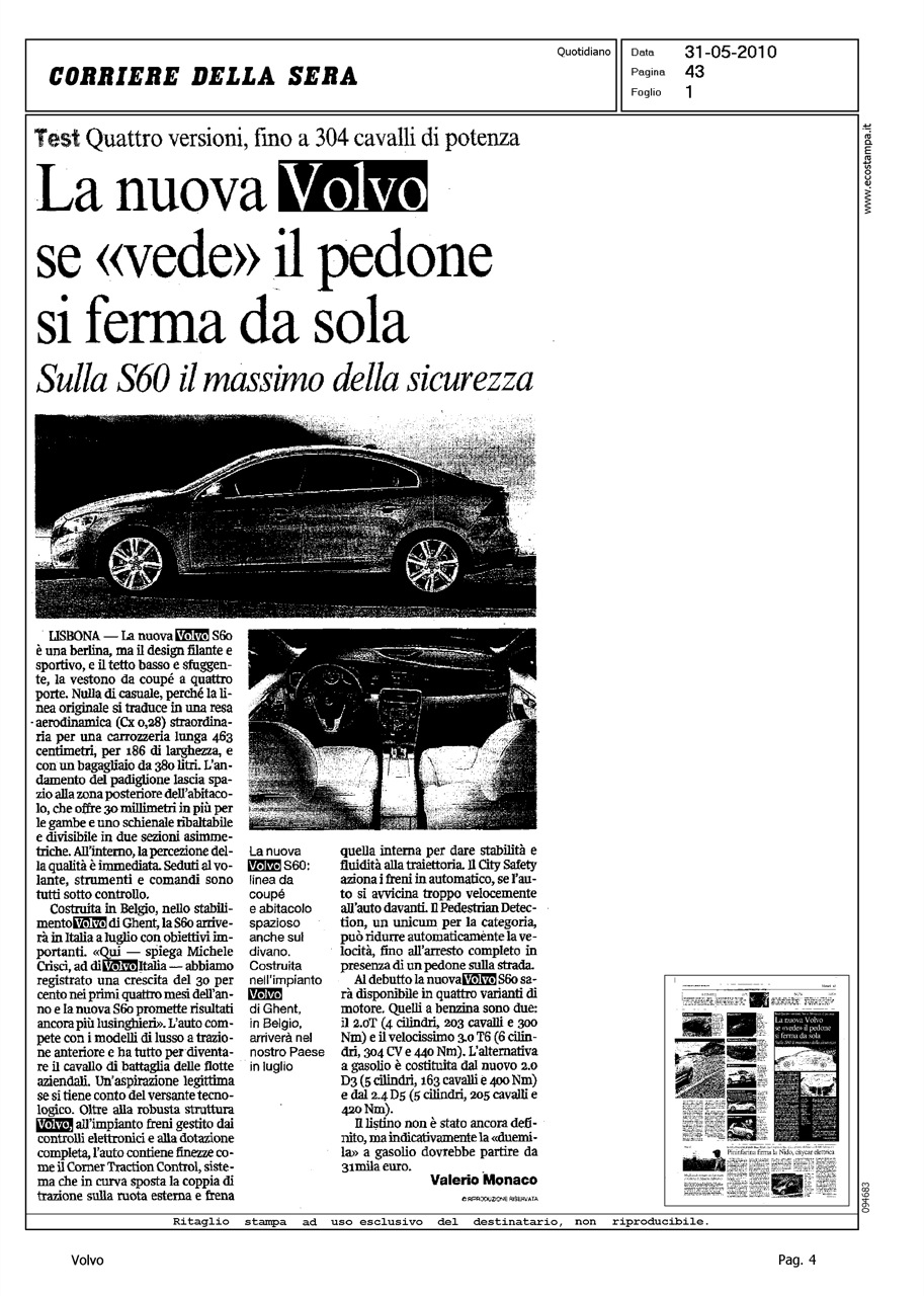 Highlight: LISBONA - DESIGN - DIMENSIONI - ABITACOLO - INTERNI, "LA PERCEZIONE DELLA QUALITA' E' IMMEDIATA" - CRISCI SU S60 - FLOTTE AZIENDALI - TECNICA - CITY SAFETY - PEDESTRIAN DETECTION - MOTORI - POTENZE - IPOTESI PREZZO