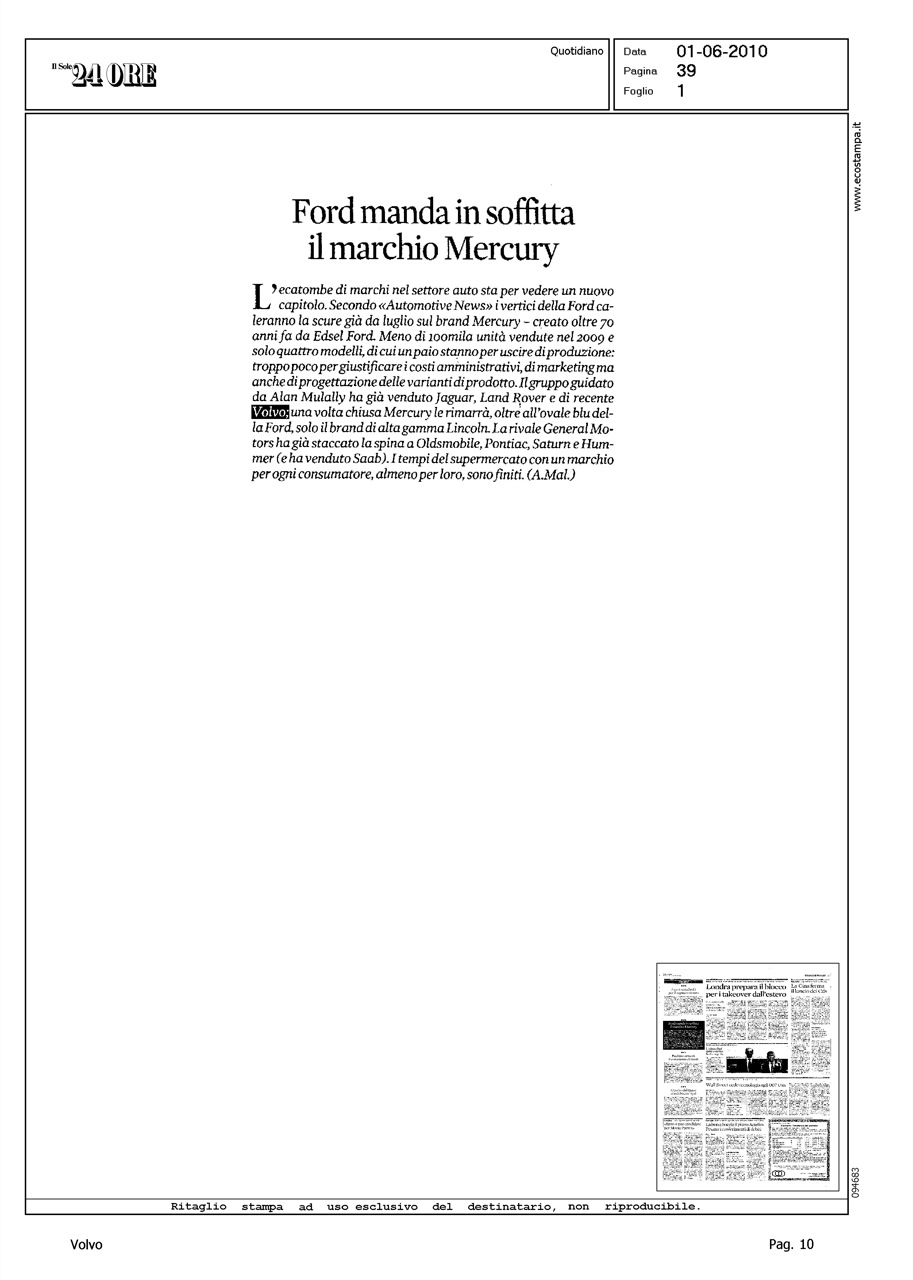 Author: Line: Corporate Model: Corporate Subject: - Title: FORD MANDA IN SOFFITTA IL MARCHIO MERCURYHighlight: CITAZIONE VENDITA VOLVO ALLA GEELY