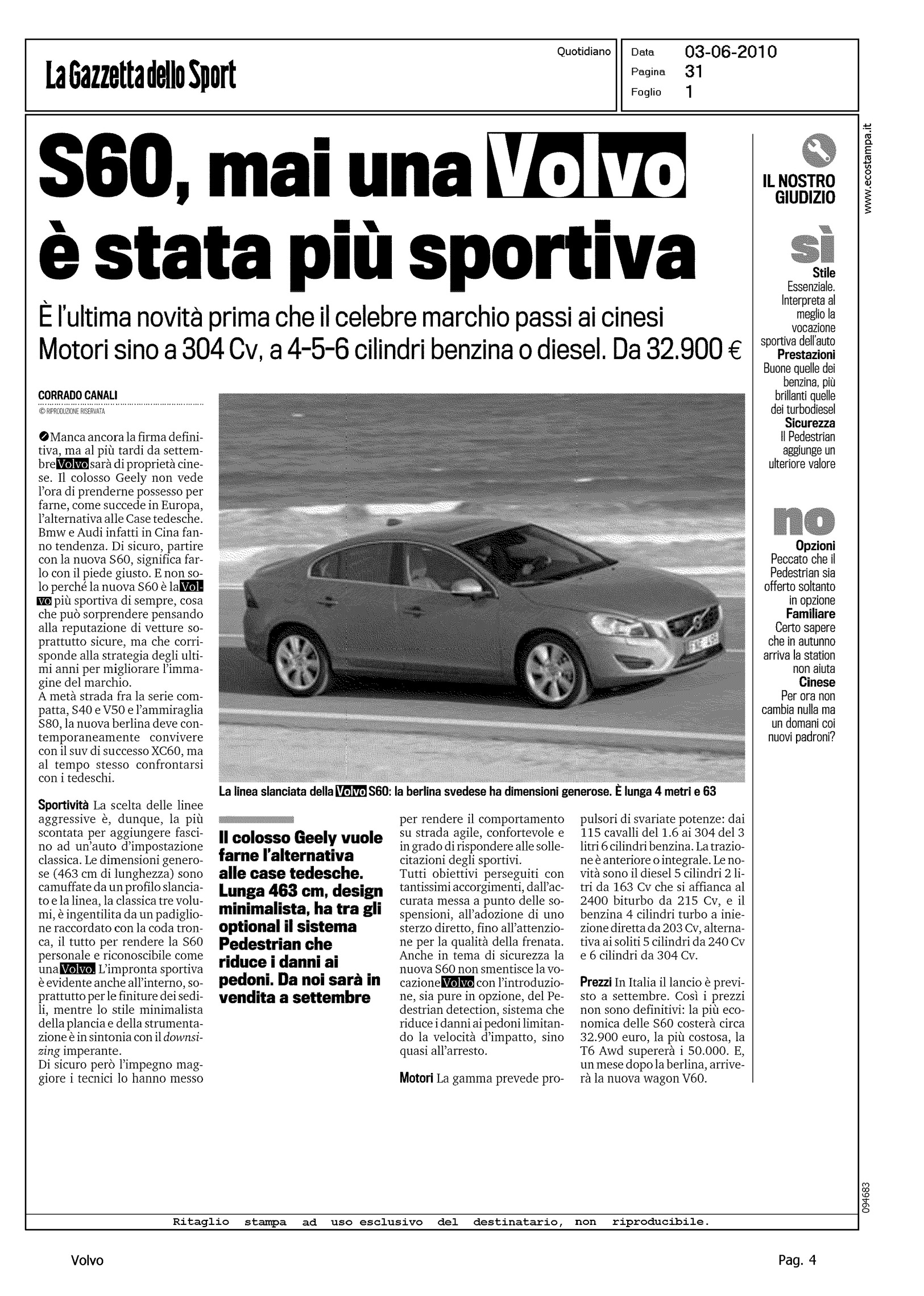 Highlight: GEELY - PROFILO PRODOTTO, "LA NUOVA S60 E' LA VOLVO PIU' SPORTIVA DI SEMPRE" - COMPETITOR, "CONFRONTARSI CON I TEDESCHI" - DESIGN, "L'IMPRONTA SPORTIVA E' EVIDENTE ANCHE ALL'INTERNO" - DINAMICA DI MARCIA - SOSPENSIONI - STERZO - SICUREZZA - PEDESTRIAN DETECTION - MOTORI - PREZZI