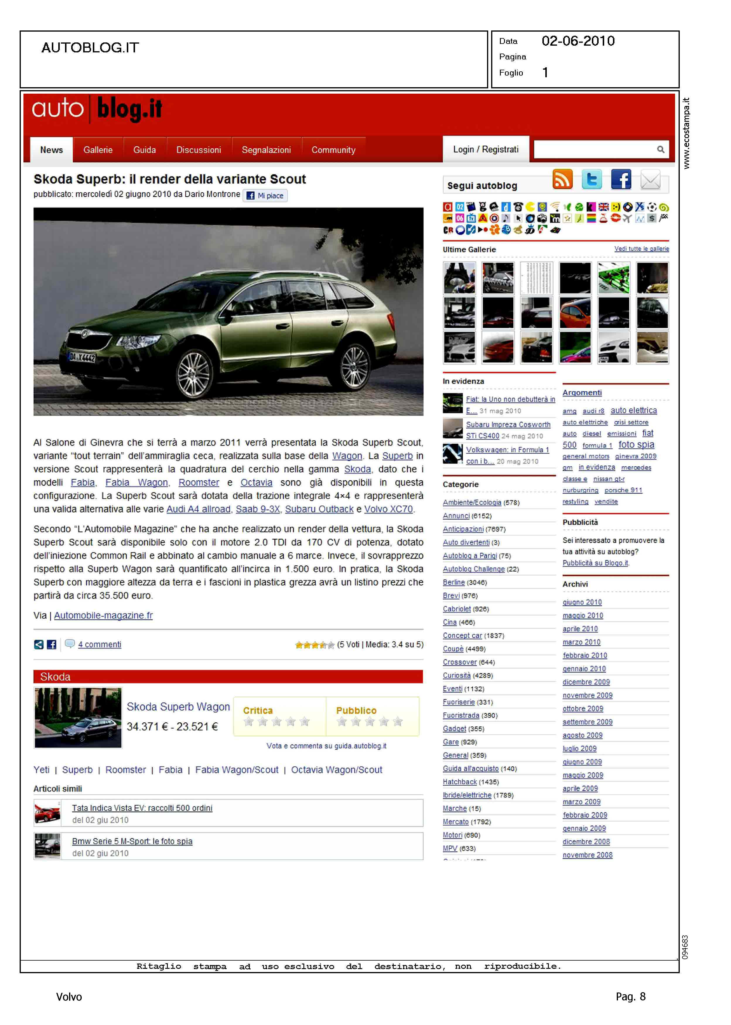 Author: Line: Corporate Model: Volvo XC70 Subject: - Title: SKODA SUPERB: IL RENDER DELLA VARIANTE SCOUTHighlight: VOLVO XC70, COMPETITOR VS AUDI A4 ALLROAD, SAAB 9-3X, SUBARU OUTBACK, SKODA SUPERB SCOUT