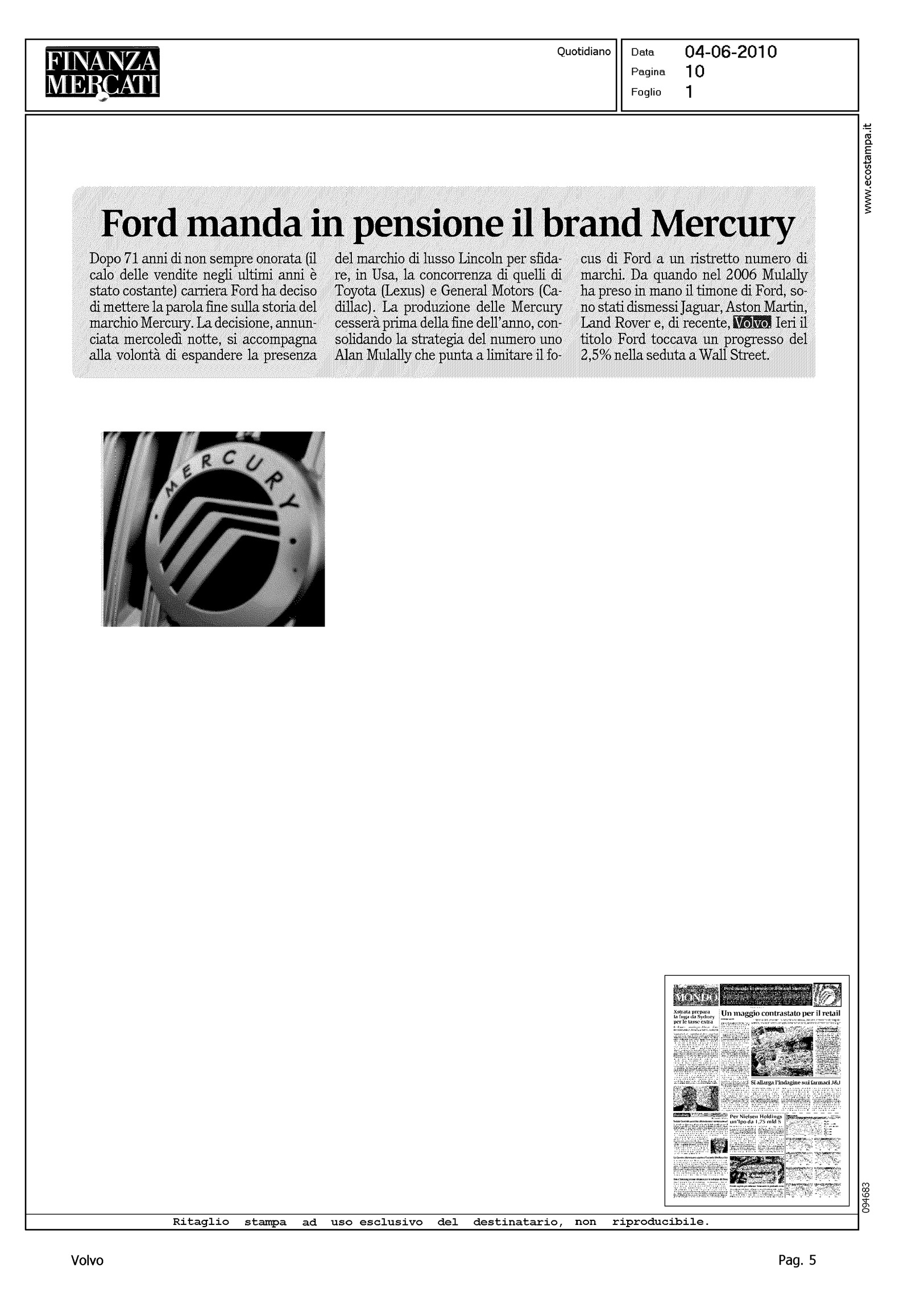 Author: Line: Corporate Model: Corporate Subject: - Title: FORD MANDA IN PENSIONE IL BRAND MERCURYHighlight: CITAZIONE IN NEWS POLITICA FORD SUI MARCHI AUTO