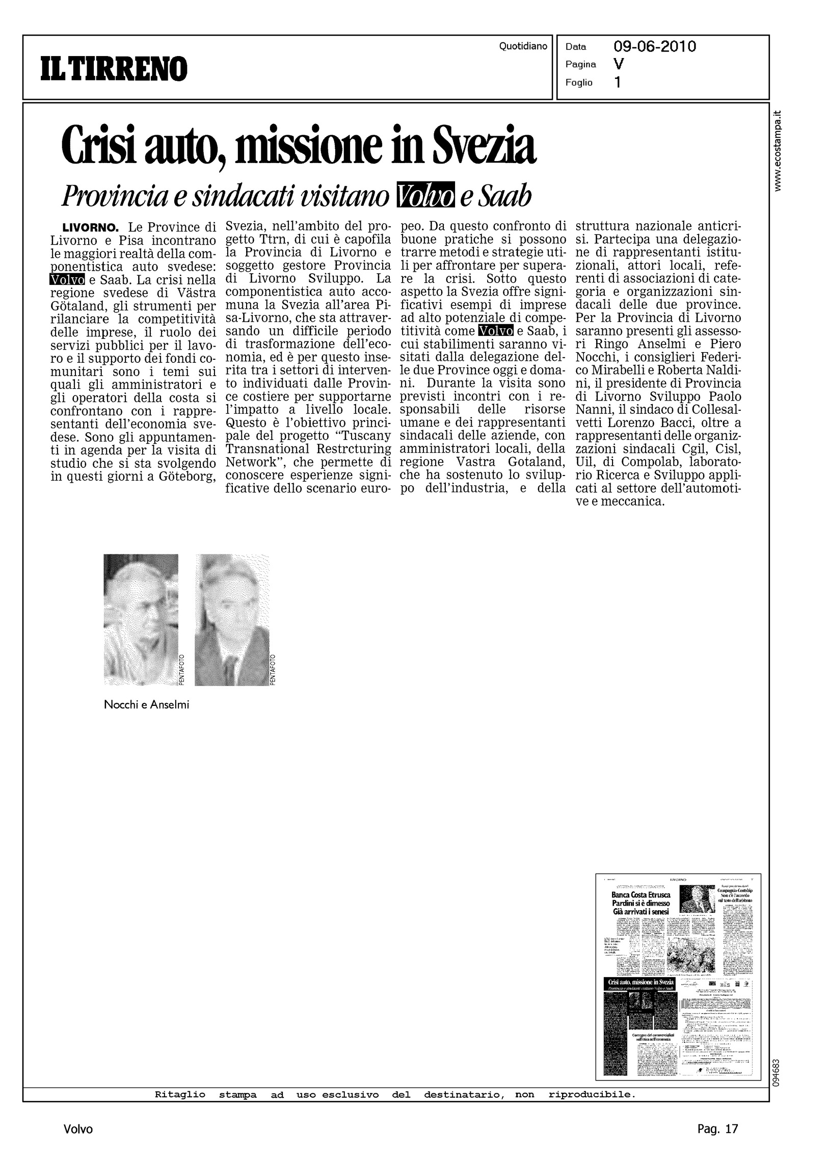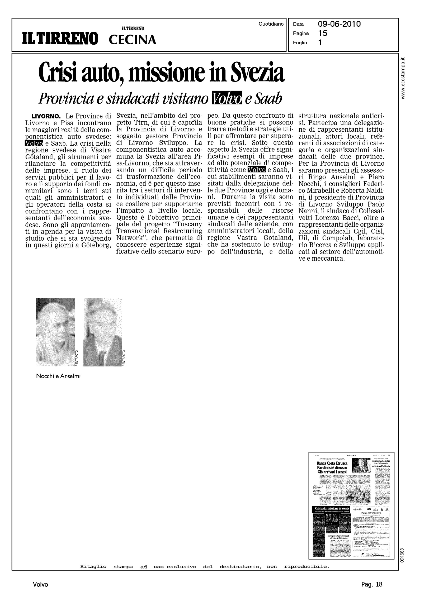 Author: Line: Corporate Model: Corporate Subject: - Title: CRISI AUTO, MISSIONE IN SVEZIAHighlight: (PIU' EDIZIONE CECINA) - PROGETTO TTRN