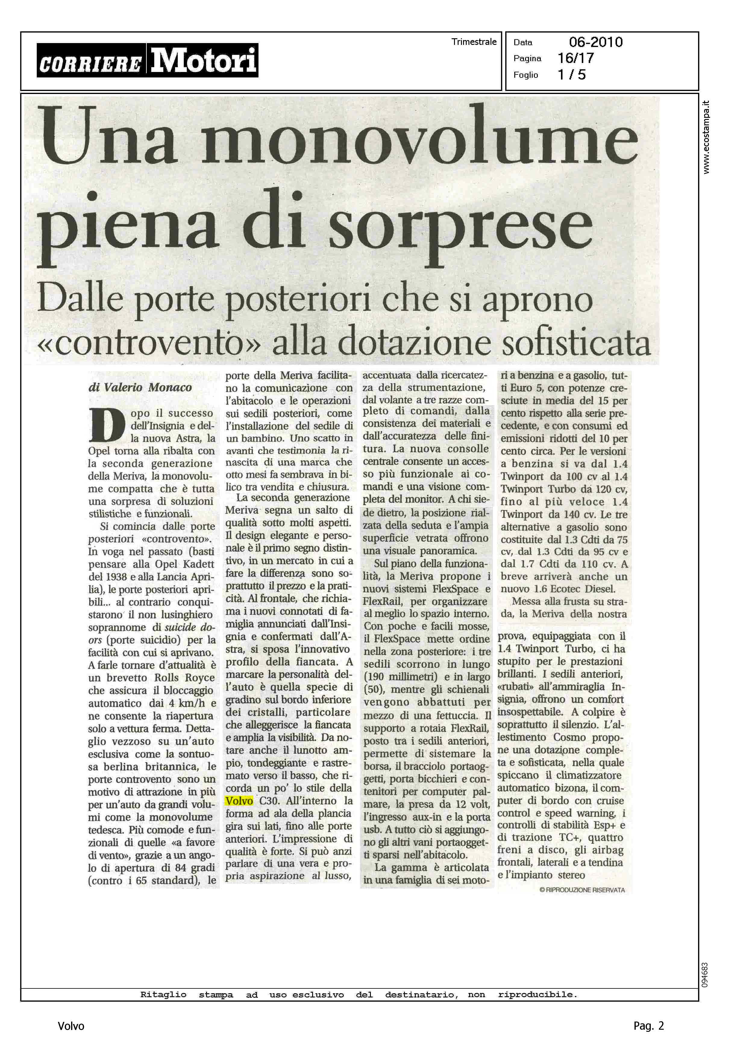 Author: MONACO, VALERIOLine: Corporate Model: Volvo C30 Subject: - Title: UNA MONOVOLUME PIENA DI SORPRESEHighlight: CITAZIONE - DESIGN