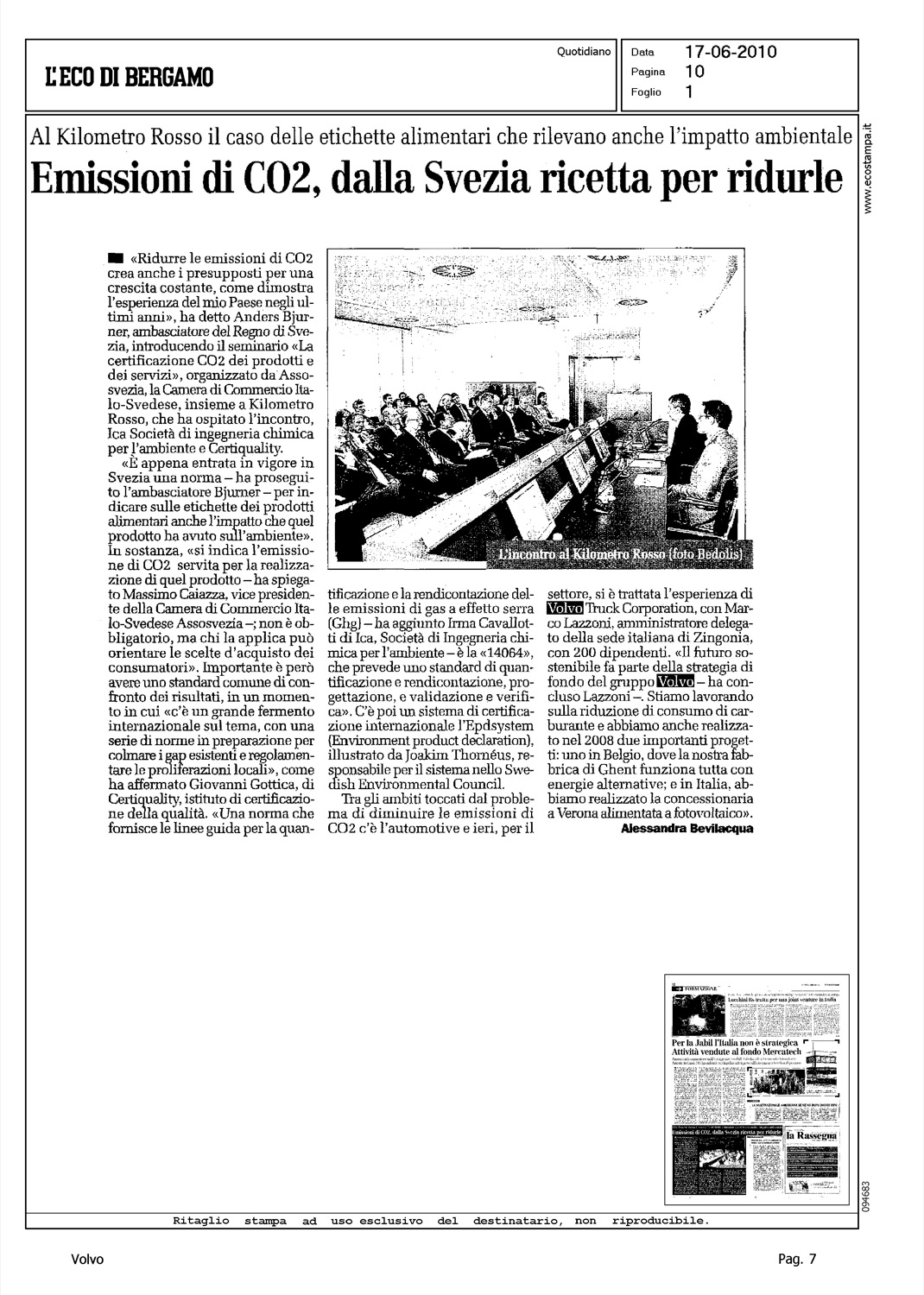 Author: BEVILACQUA, ALESSANDRALine: Corporate Model: Corporate Subject: - Title: EMISSIONI DI CO2, DALLA SVEZIA RICETTA PER RIDURLEHighlight: RIDUZIONE EMISSIONI CO2, VOLVO TRUCK