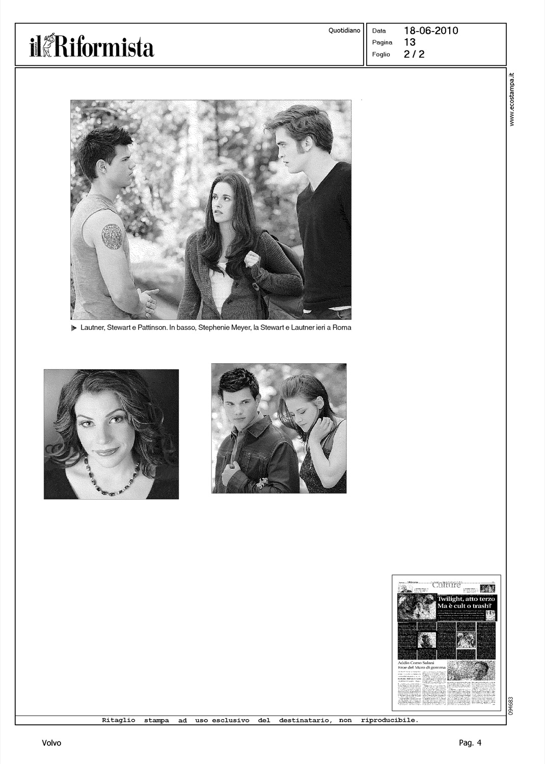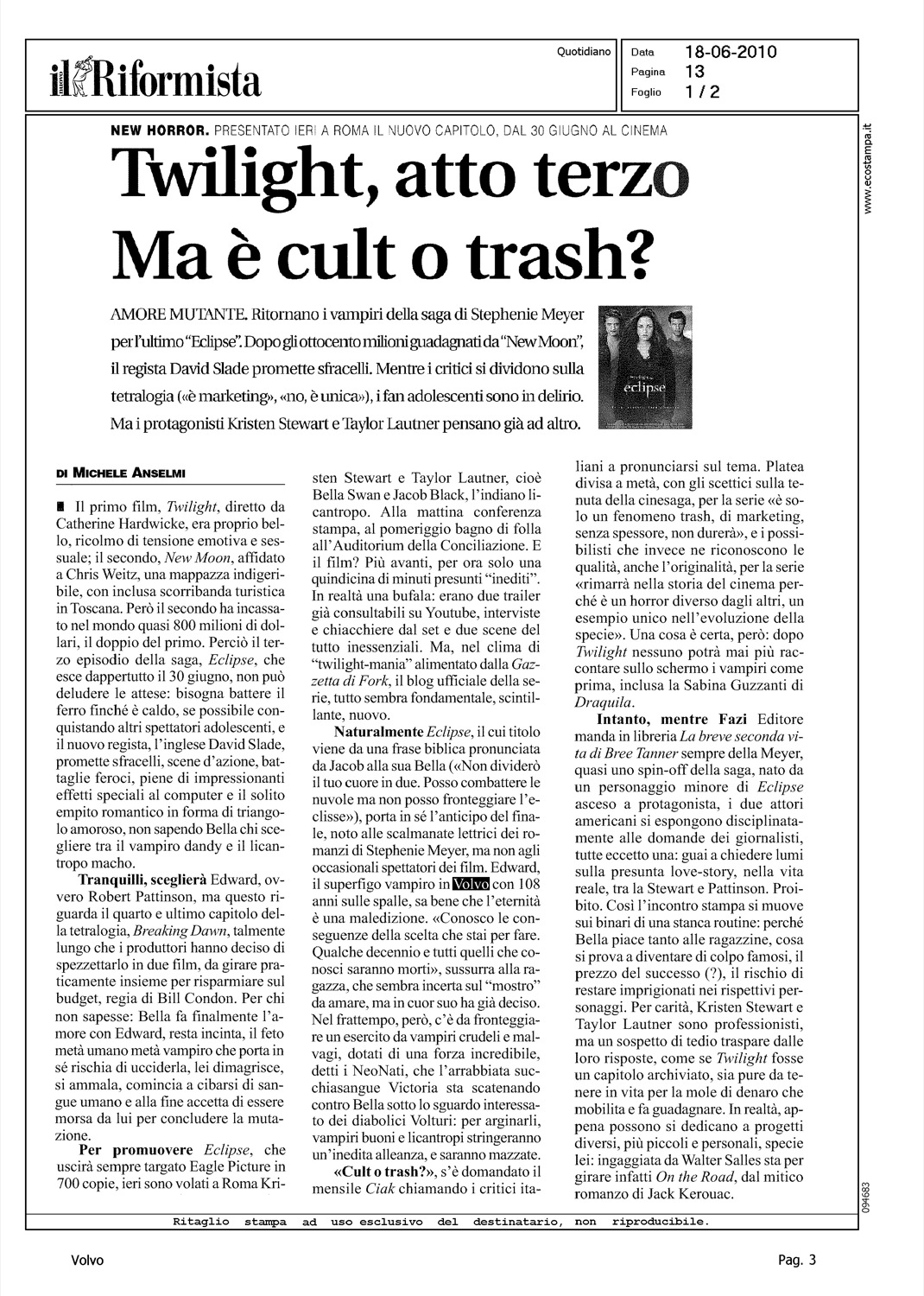 Author: ANSELMI, MICHELELine: Corporate Model: Corporate Subject: - Title: TWILIGHT, ATTO TERZO - MA E' CULT O TRASHHighlight: CITAZIONE, ARTICOLO PRESENTAZIONE TERZO FILM