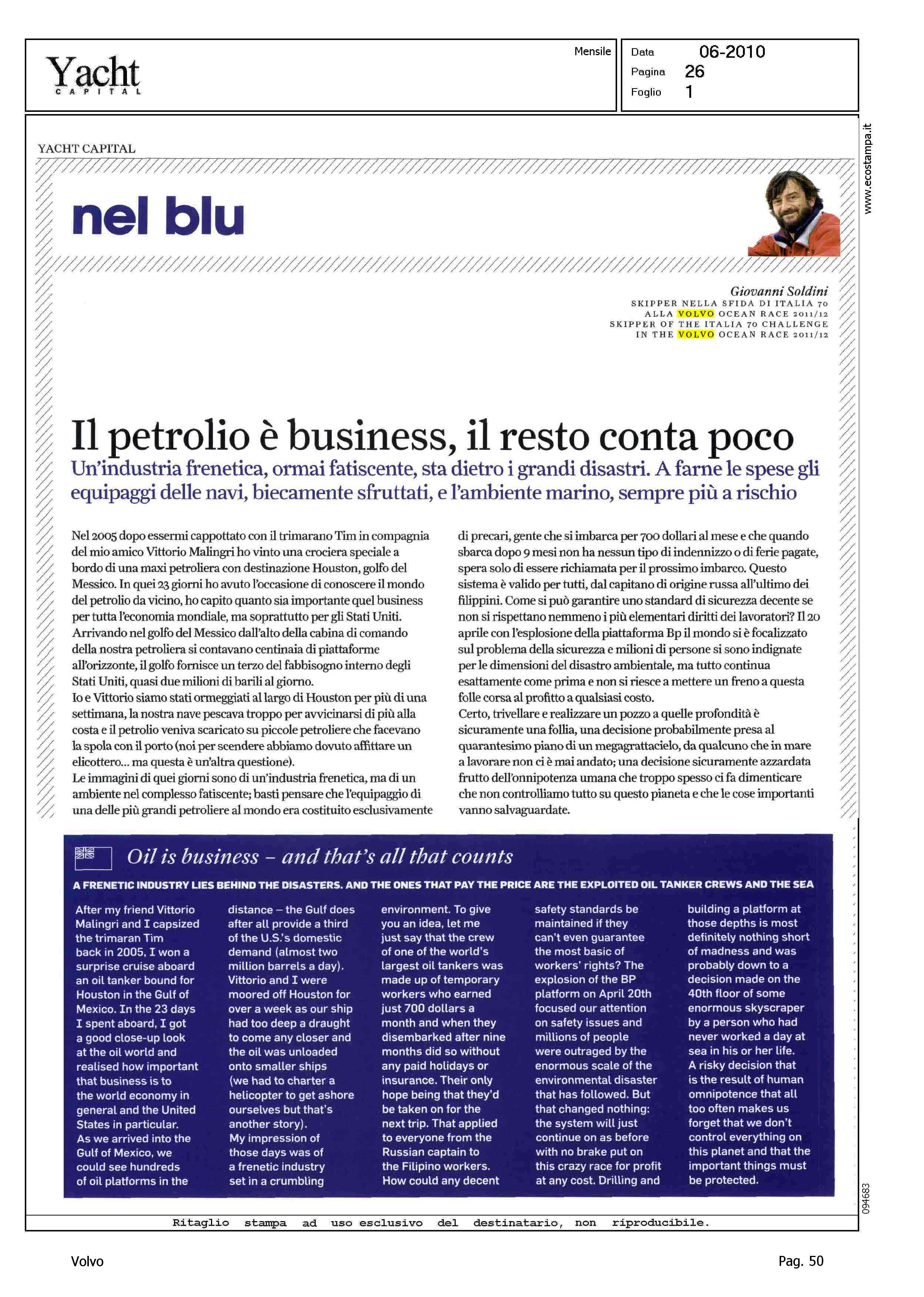 Author: SOLDINI, GIOVANNILine: Corporate Model: Corporate Subject: Volvo Ocean Race Title: NEL BLU - IL PETROLIO E' BUSINESS, IL RESTO CONTA POCOHighlight: CITAZIONE, EDITORIALE