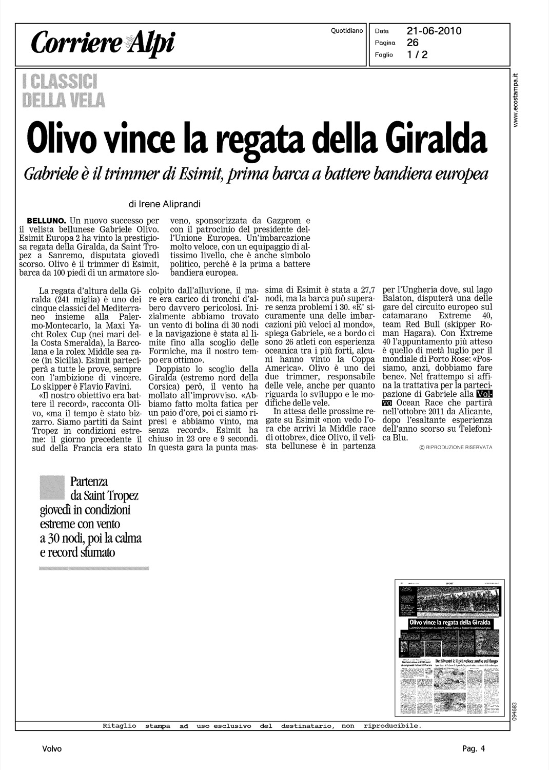 Author: ALIPRANDI, IRENELine: Corporate Model: Corporate Subject: Volvo Ocean Race Title: I CLASSICI DELLA VELA - OLIVO VINCE LA REGATA DELLA "GIRALDA" (ndr ?)Highlight: CITAZIONE, OLIVO, REGATA GIRAGLIA
