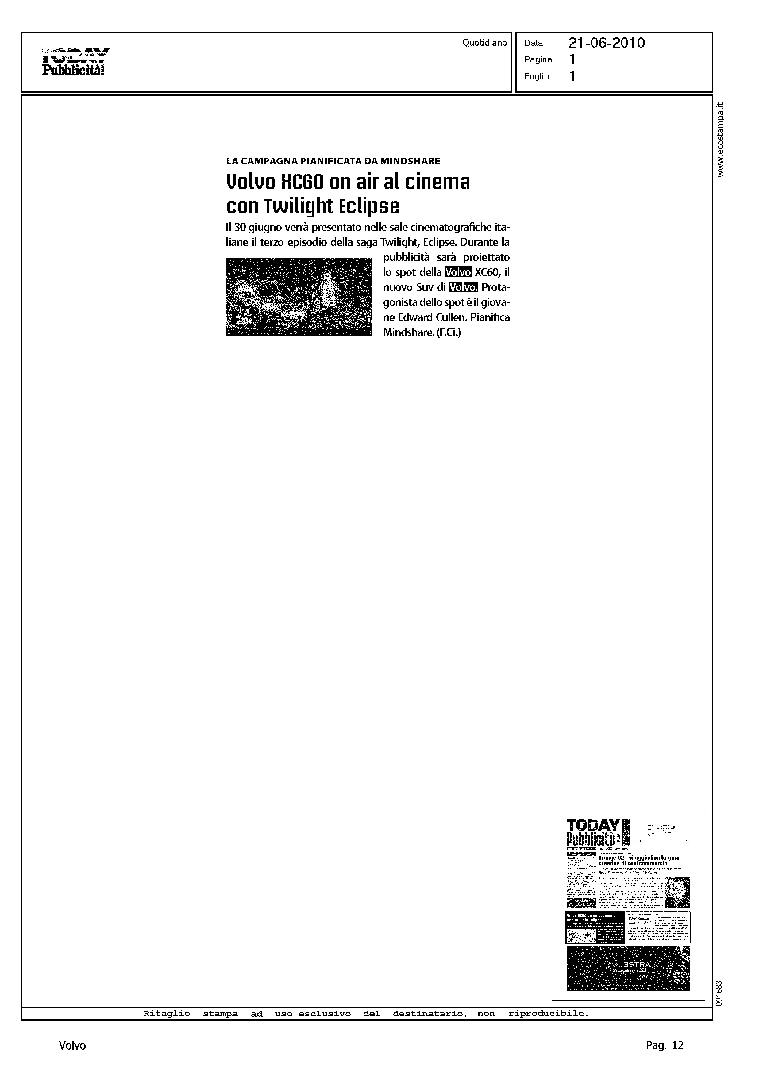 Author: Line: XC60 Model: Subject: - Title: VOLVO XC60 ON AIR AL CINEMA CON TWILIGHT ECLIPSEHighlight: CAMPAGNA PUBBLICITA' FILM CON SPOT VOLVO XC60 - CULLEN - MINDSHARE