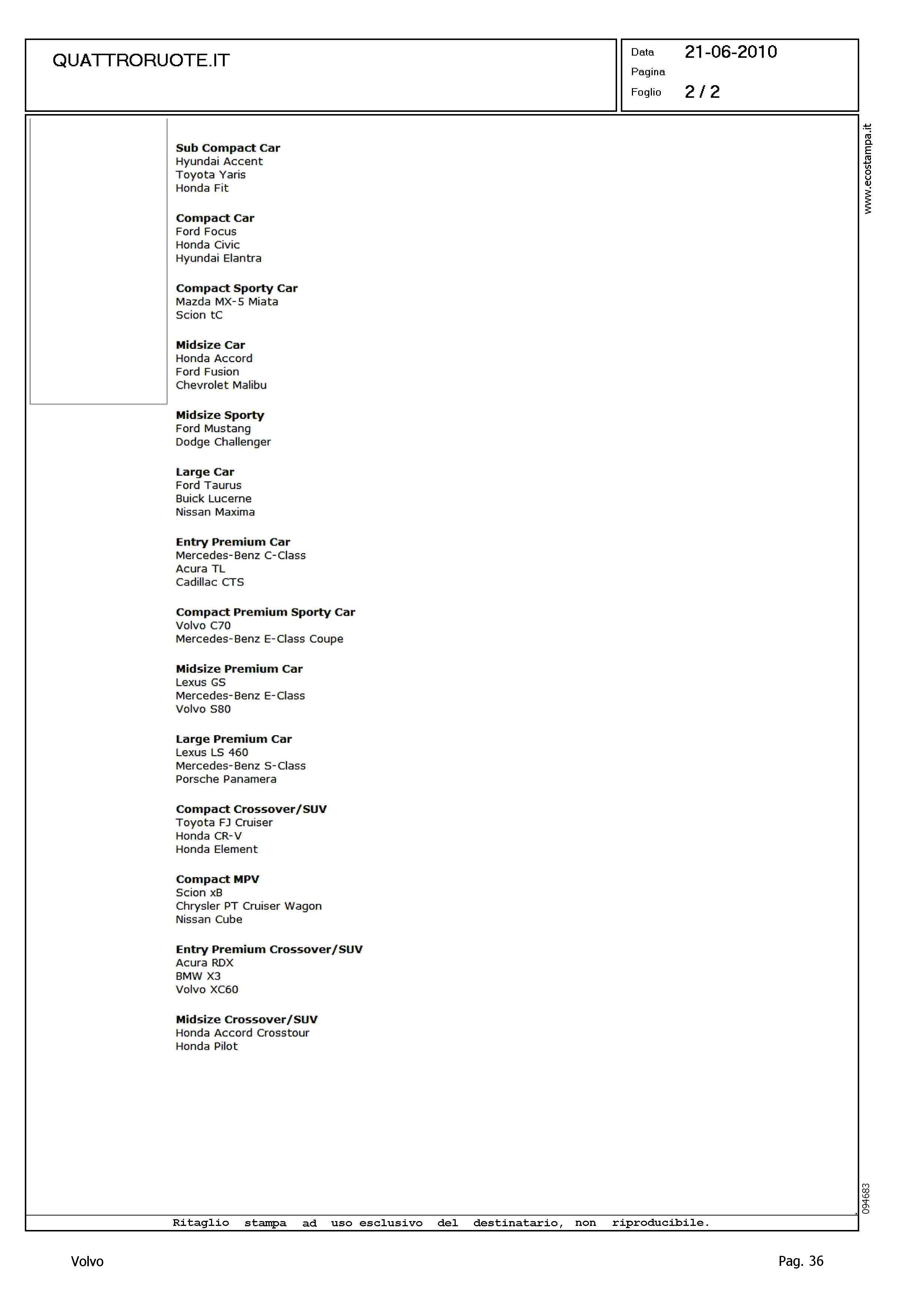 Highlight: JD POWER RATING - CLASSIFICA DI QUALITA' - COMPACT PREMIUM SPORTY CAR, VOLVO C70 - MIDSIZE PREMIUM CAR, VOLVO S80 - ENTRY PREMIUM CROSSOVER/SUV, VOLVO XC60