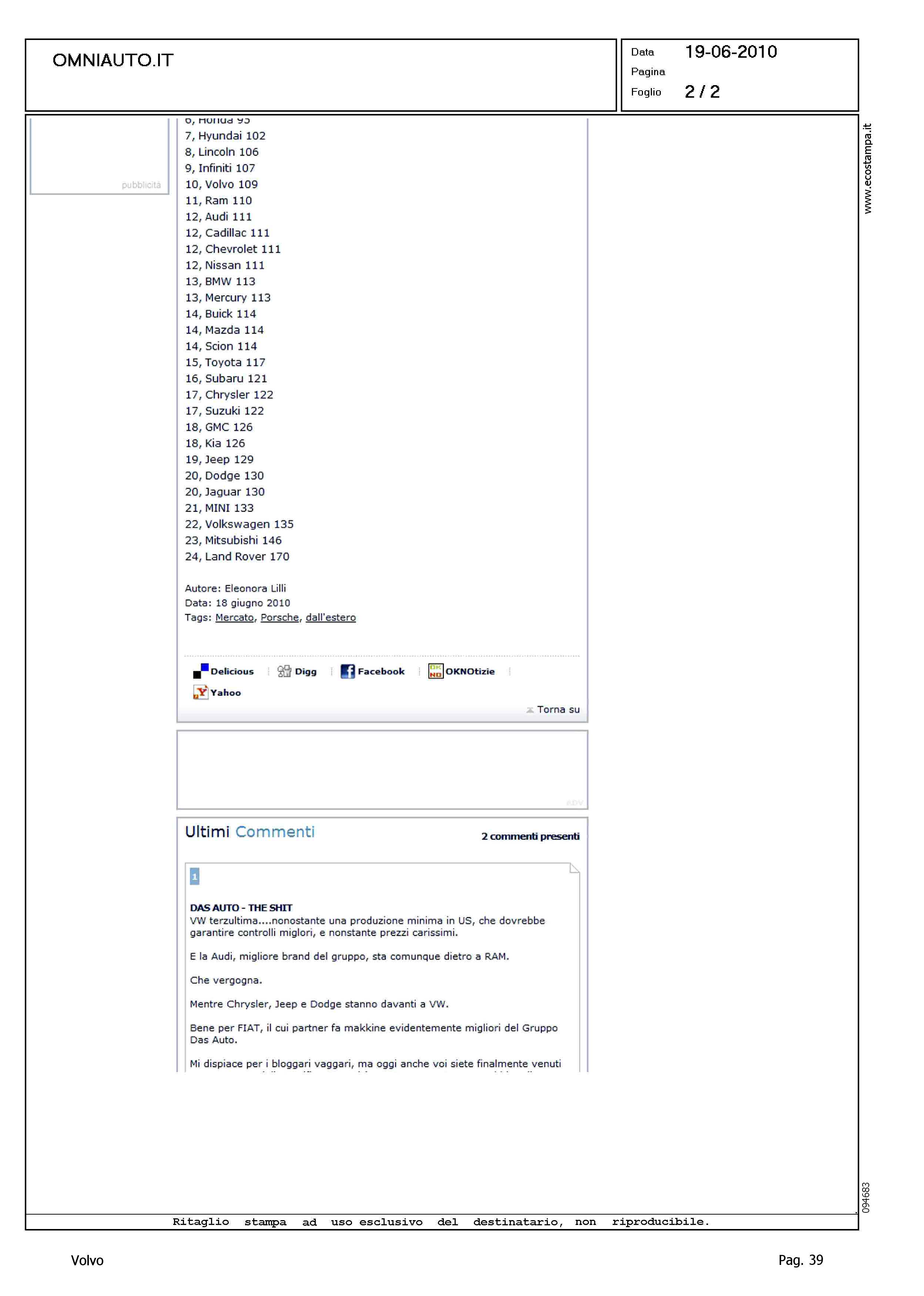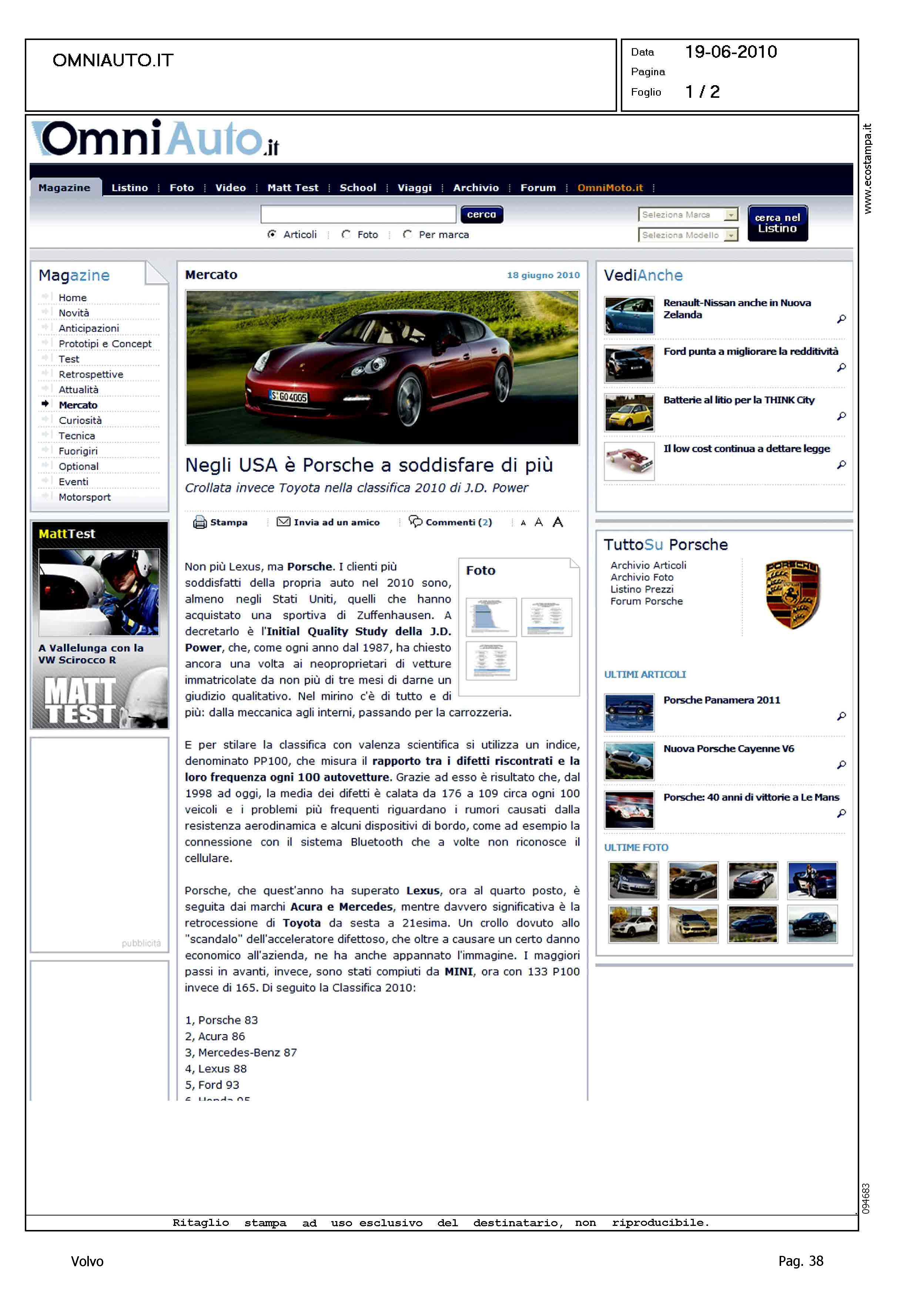 Author: Line: Corporate Model: Corporate Subject: - Title: MERCATO - NEGLI USA E' PORSCHE A SODDISFARE DI PIU'Highlight: JD POWER RATING - CLASSIFICA DI QUALITA' 2010: VOLVO, 10°, 109p