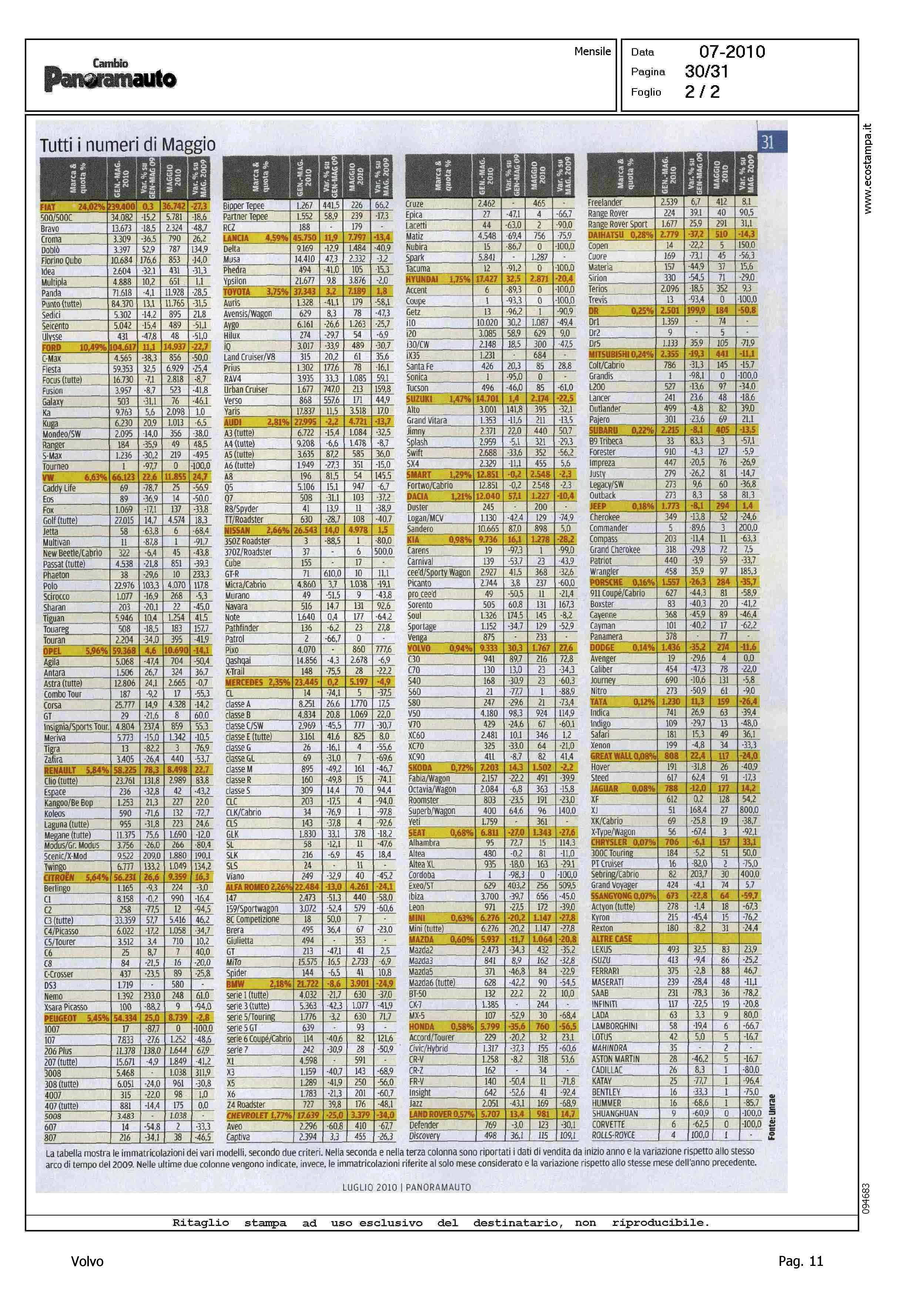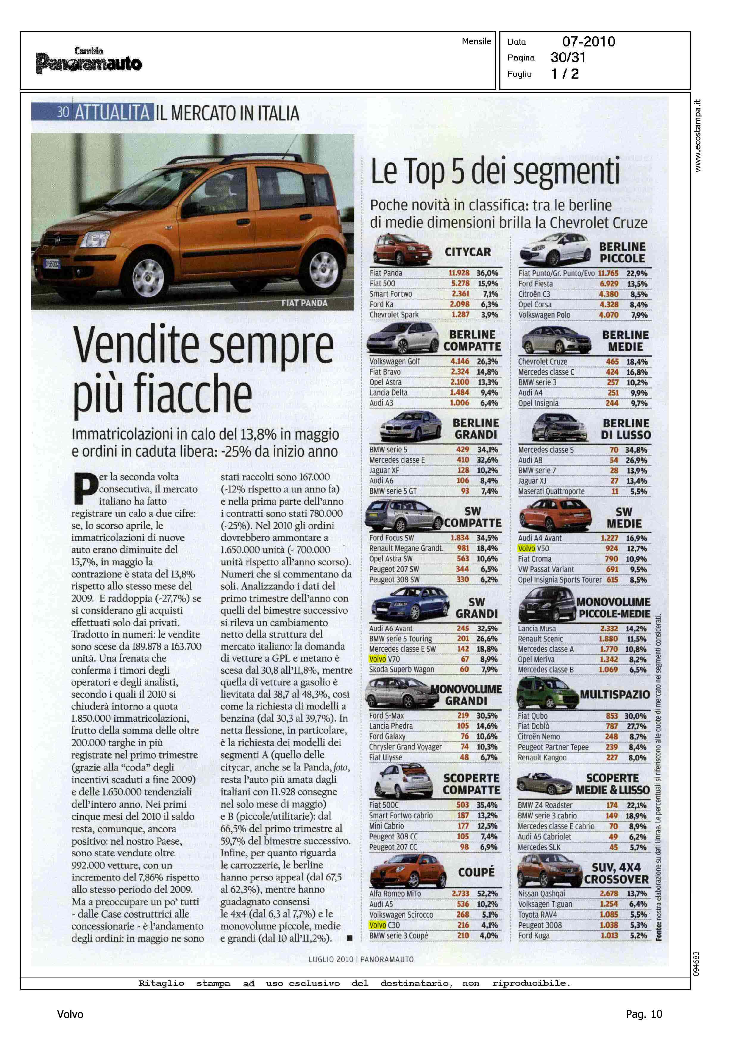 Author: Line: Corporate Model: Corporate Subject: - Title: VENDITE SEMPRE PIU' FIACCHEHighlight: TABELLE - TOP 5 PER SEGMENTO - SW GRANDI, VOLVO V70, 4° - COUPE, VOLVO C30, 4° - SW MEDIE, VOLVO V50, 2°