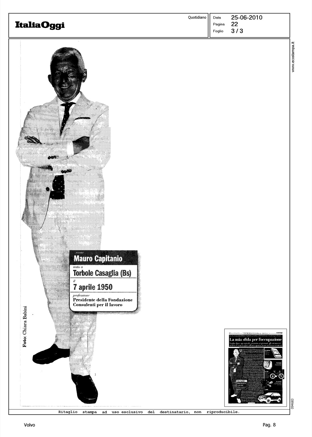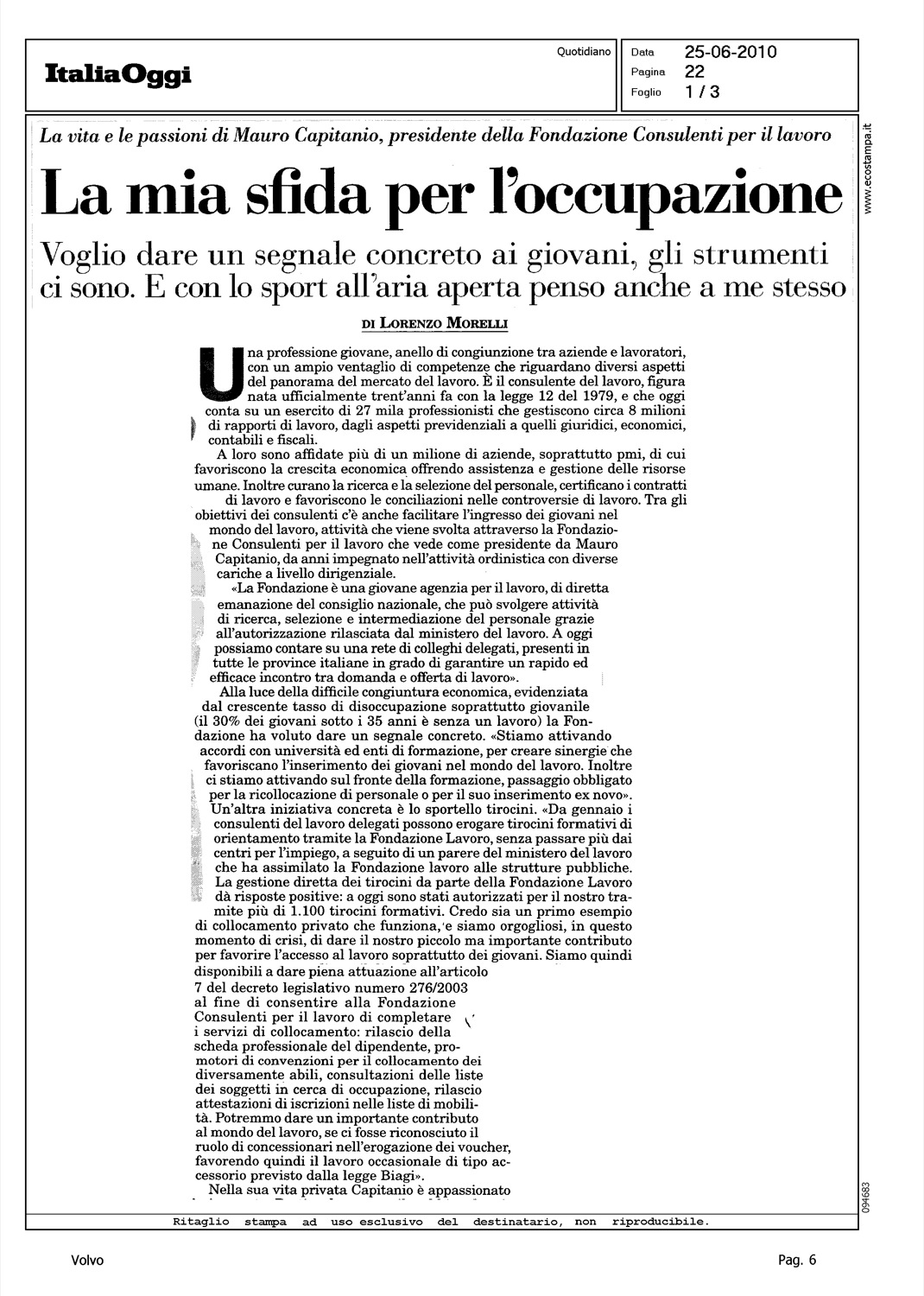 Author: MORELLI, LORENZOLine: Corporate Model: Volvo XC90 Subject: - Title: LA MIA SFIDA PER L'OCCUPAZIONEHighlight: PERSONAGGI, MAURO CAPITANIO - PRESIDENTE FONDAZIONE CONSULENTI PER IL LAVORO - LA SUA AUTO: VOLVO XC90 (FOTOGRAFIA)