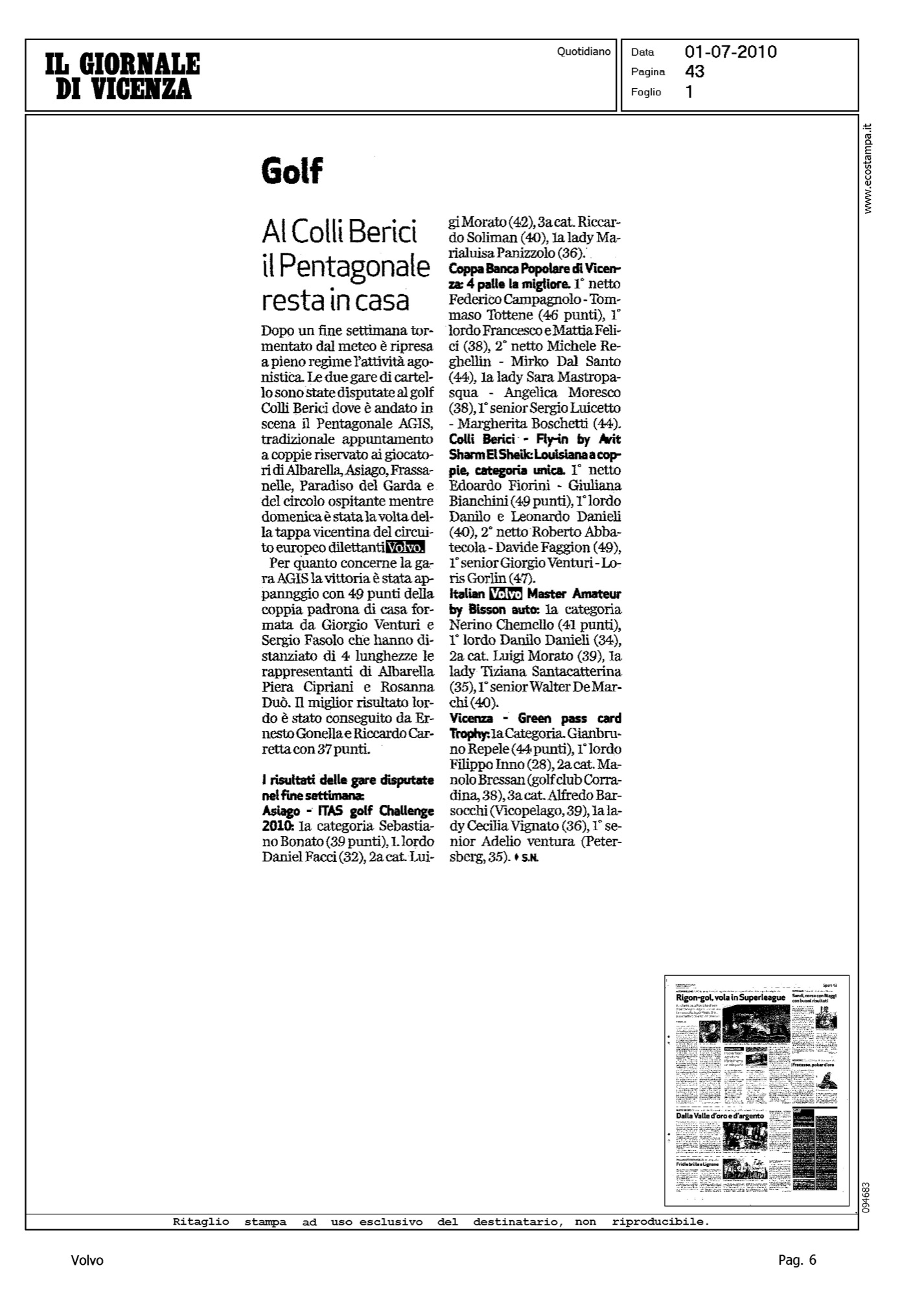 Author: Line: Corporate Model: Corporate Subject: Volvo Master Title: GOLF - AI COLLI BERICI IL PENTAGONALE RESTA IN CASAHighlight: CIRCUITO EUROPEO DILETTANTI VOLVO - GARA DI VICENZA
