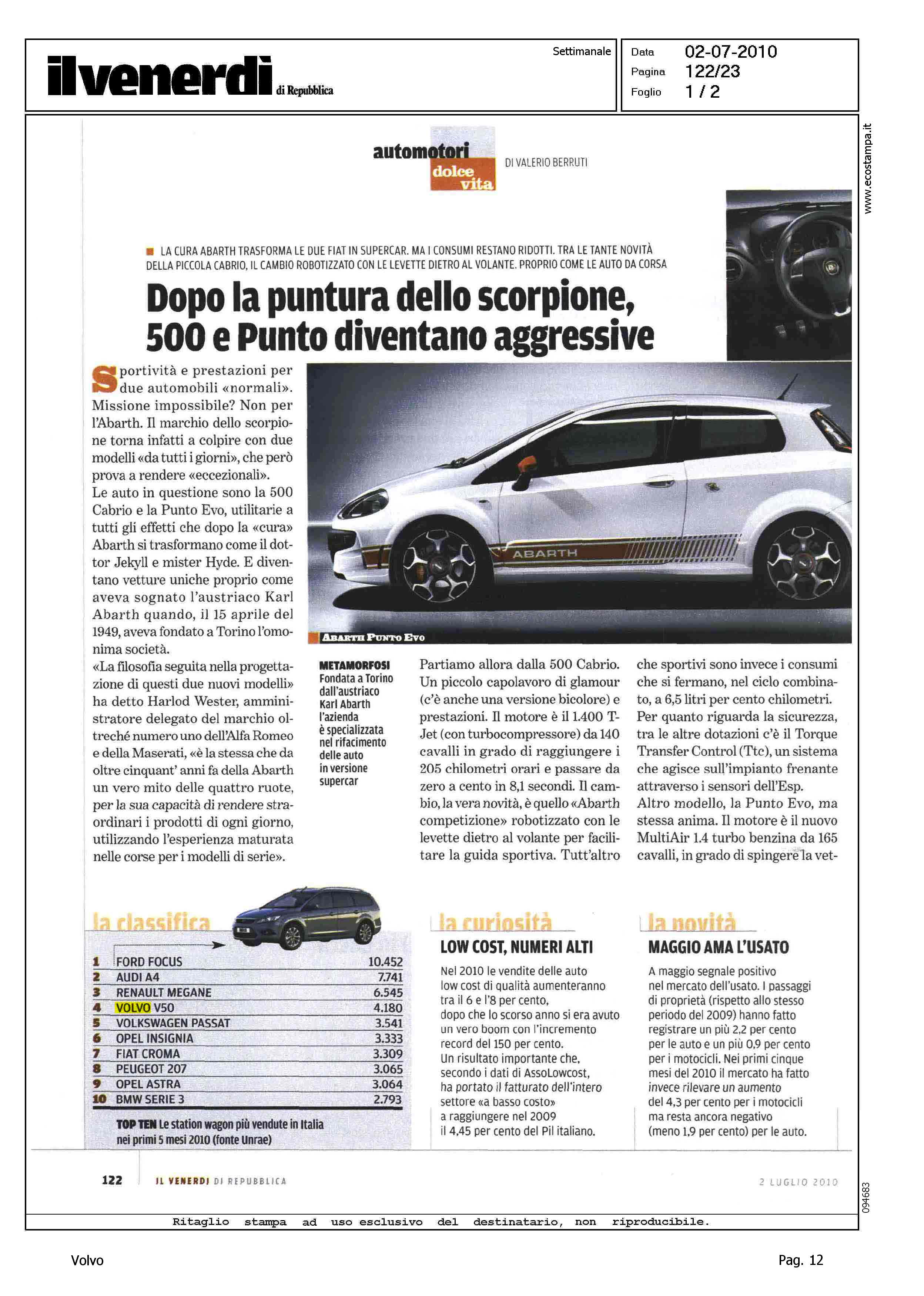 Author: BERRUTI, VALERIOLine: Corporate Model: Volvo S40 - V50 Subject: - Title: LA CLASSIFICAHighlight: TABELLA MERCATO ITALIA, 5 MESI, STATION WAGON - VOLVO V50, 4.180, 4/10