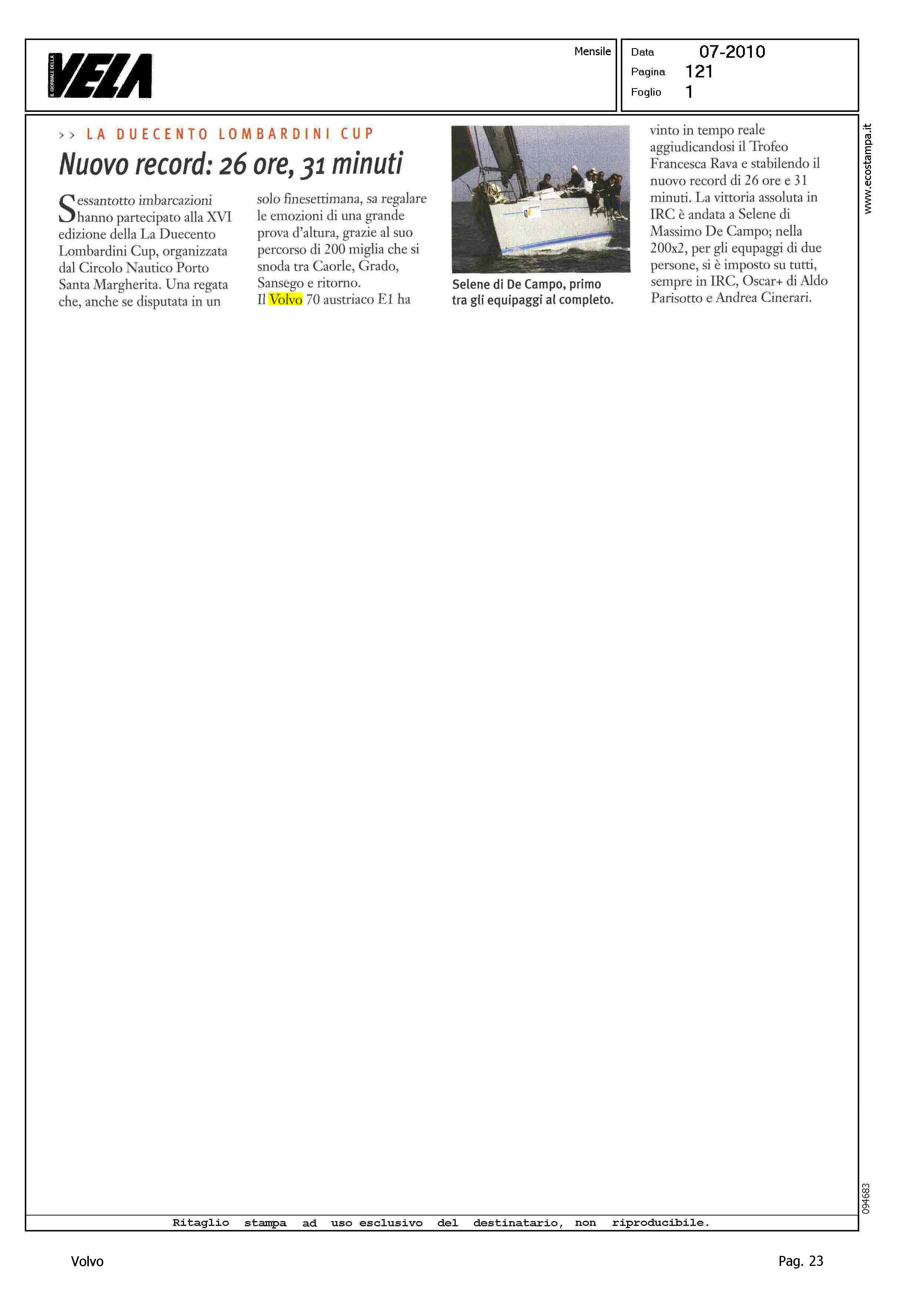 Author: Line: Corporate Model: Corporate Subject: - Title: NUOVO RECORD: 26 ORE, 31 MINUTIHighlight: VOLVO 70 E1 - TROFEO FRANCESCO RAVA