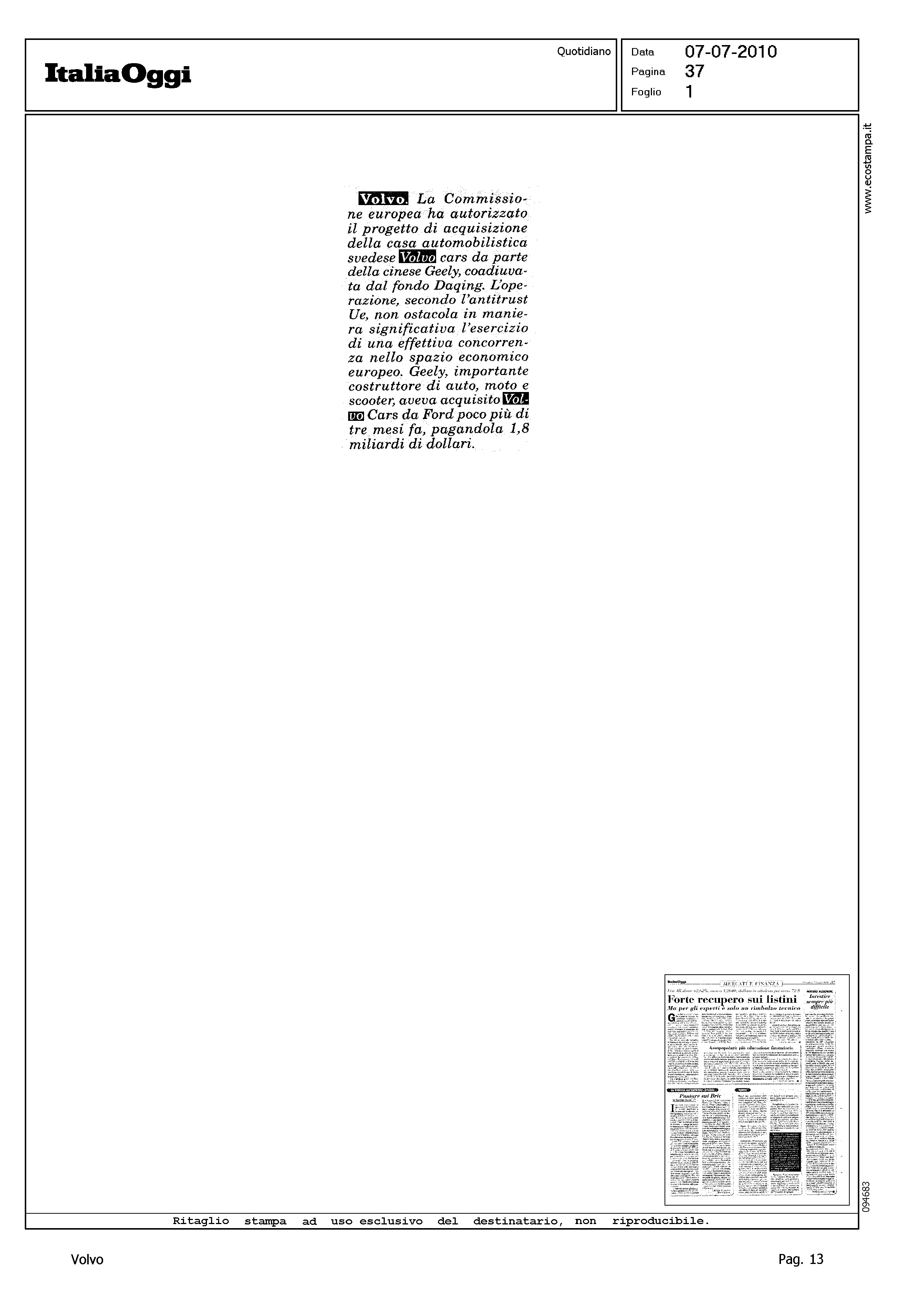 Author: Line: Corporate Model: Corporate Subject: - Title: VOLVO. LA COMMISSIONE EUROPEA HA AUTORIZZATO...Highlight: VENDITA VOLVO ALLA GEELY, APPROVAZIONE UE
