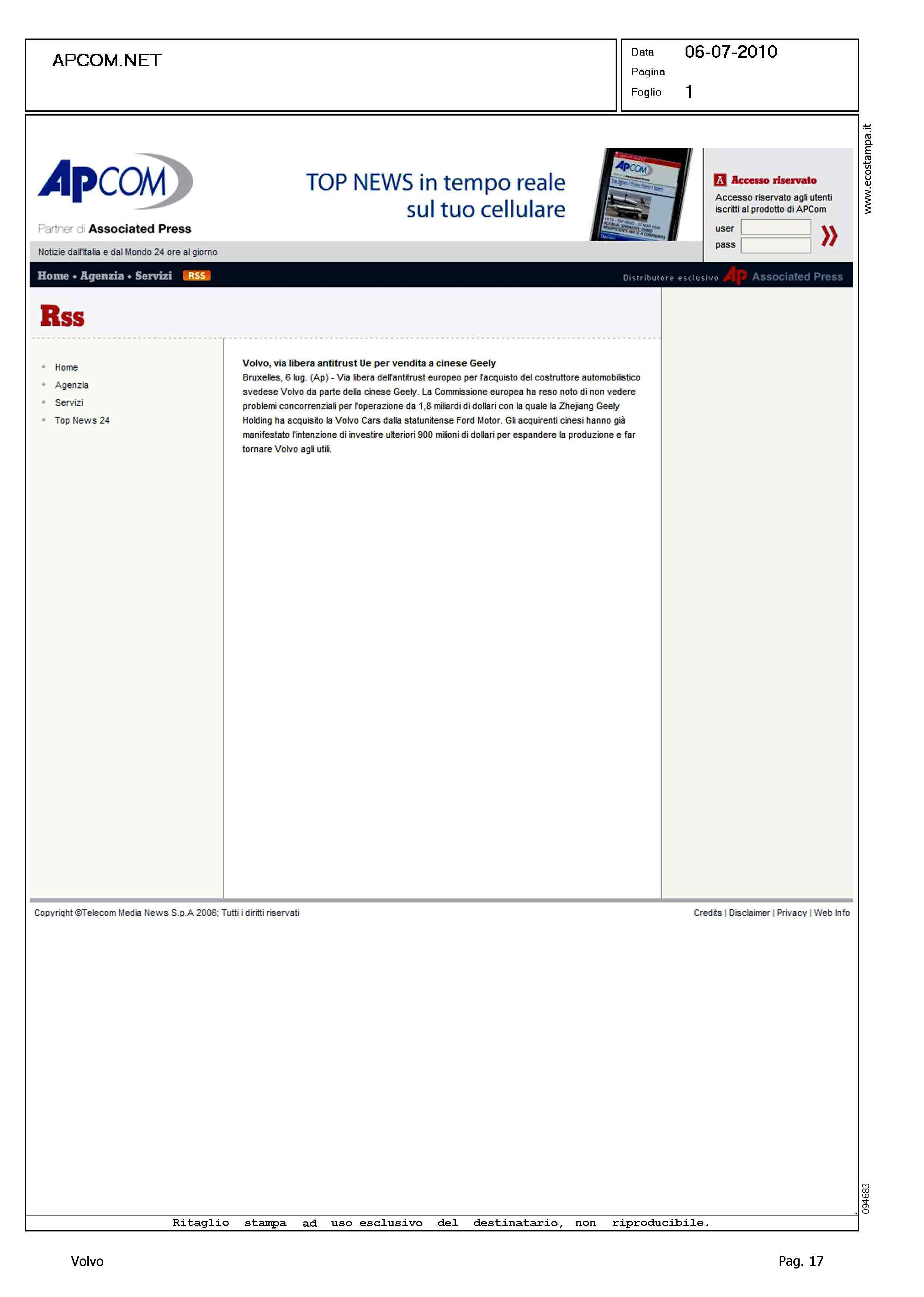 Author: Line: Corporate Model: Corporate Subject: - Title: VOLVO, VIA LIBERA ANTITRUST UE PER VENDITA A CINESE GEELYHighlight: VENDITA VOLVO ALLA GEELY, APPROVAZIONE UE