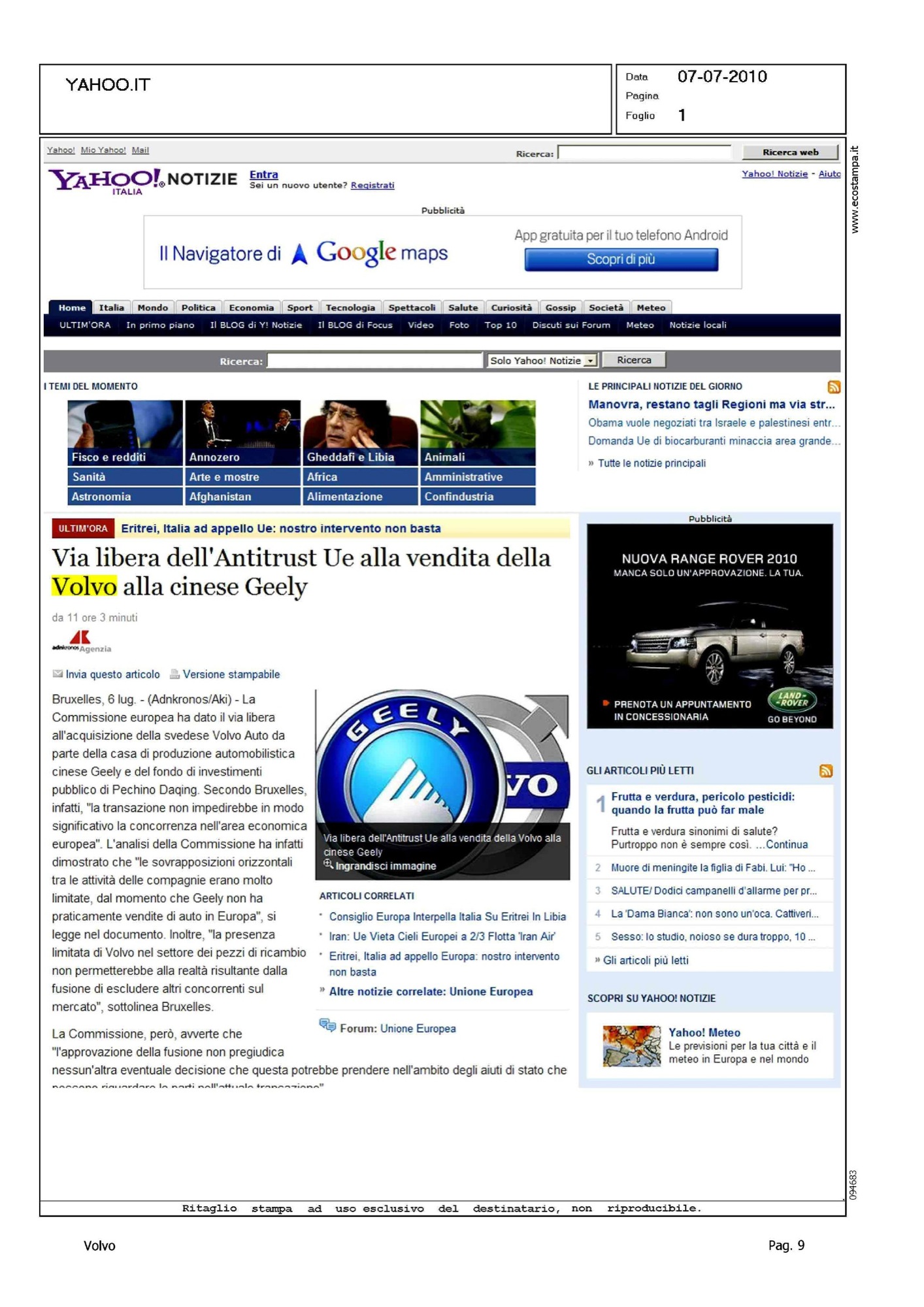 Author: Line: Corporate Model: Corporate Subject: - Title: VIA LIBERA DELL'ANTITRUST UE ALLA VENDITA DELLA VOLVO ALLA CINESE GEELYHighlight: VENDITA VOLVO ALLA GEELY, APPROVAZIONE UE