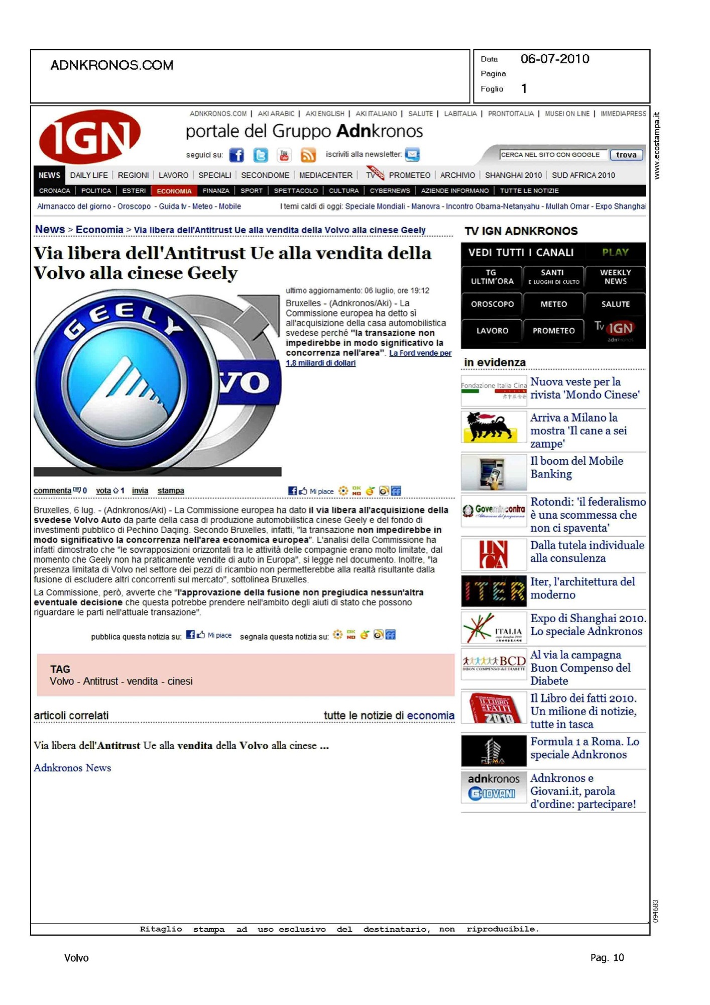 Author: Line: Corporate Model: Corporate Subject: - Title: VIA LIBERA DELL'ANTITRUST UE ALLA VENDITA DELLA VOLVO ALLA CINESE GEELYHighlight: VENDITA VOLVO ALLA GEELY, APPROVAZIONE UE