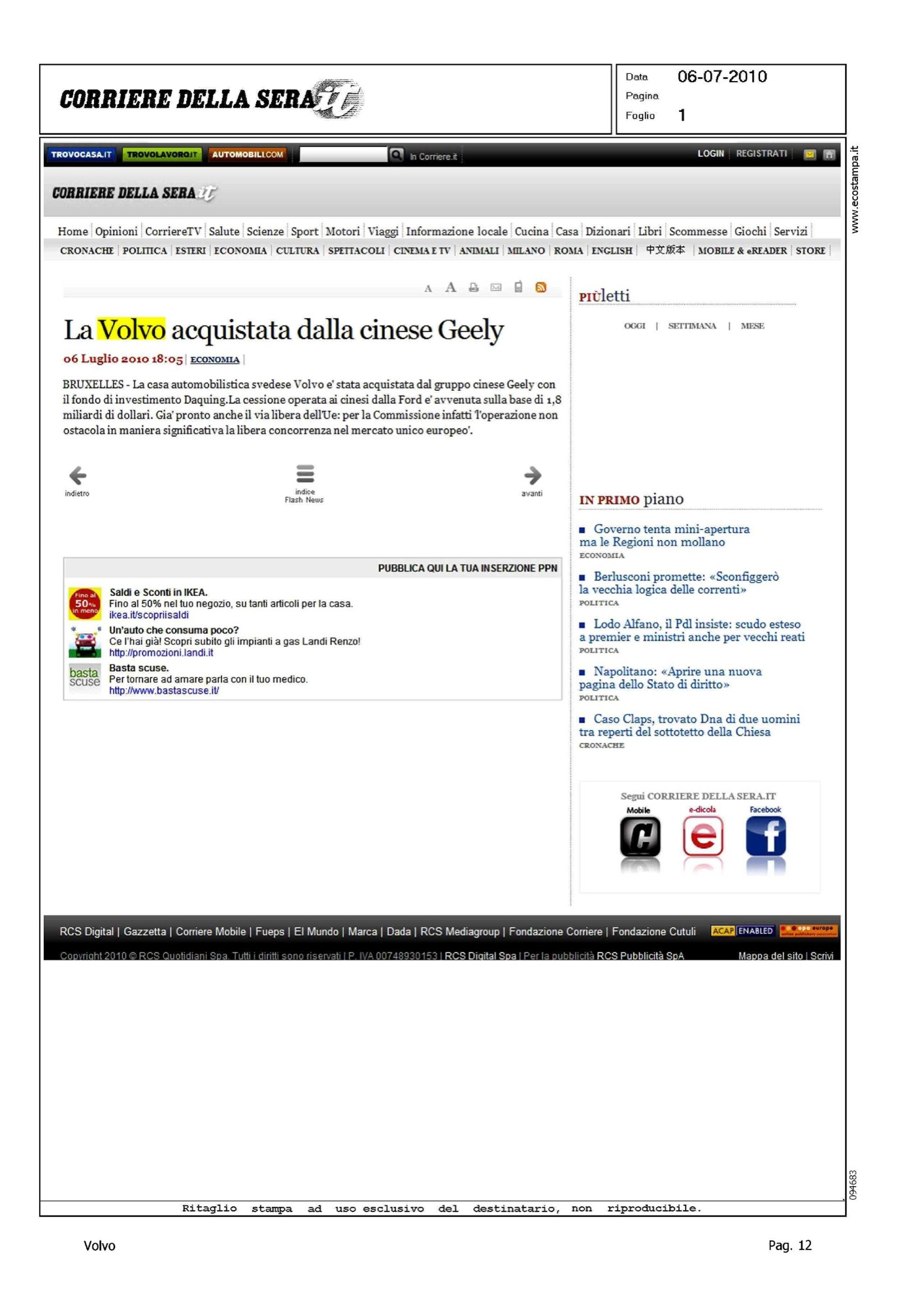 Author: Line: Corporate Model: Corporate Subject: - Title: LA VOLVO ACQUISTATA DALLA CINESE GEELYHighlight: VENDITA VOLVO ALLA GEELY, APPROVAZIONE UE