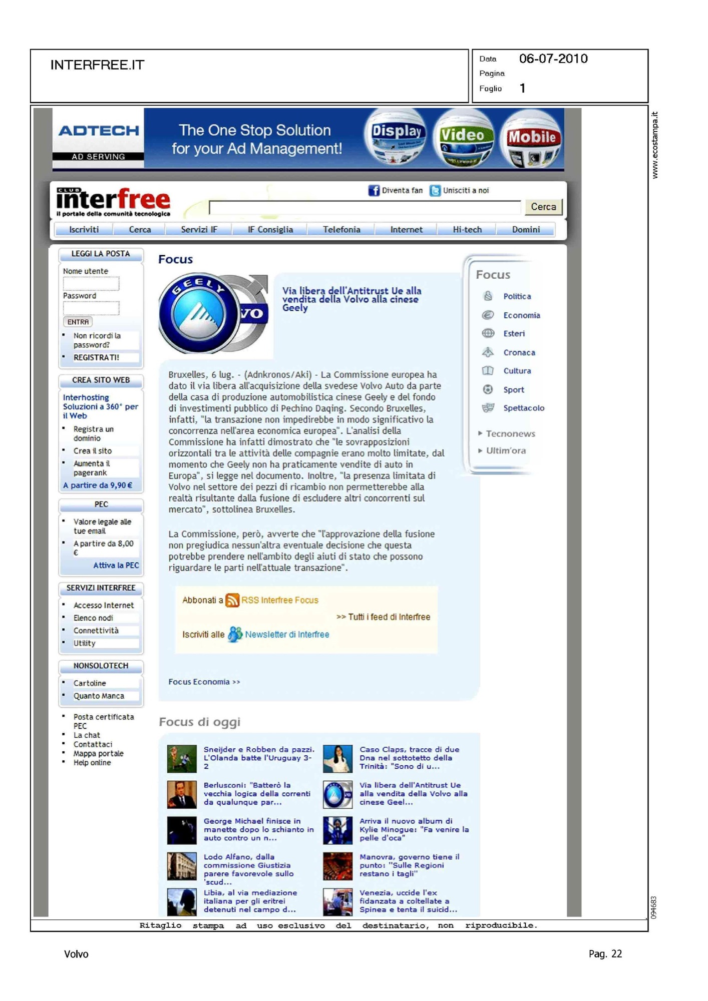 Author: Line: Corporate Model: Corporate Subject: - Title: VIA LIBERA DELL'ANTITRUST UE ALLA VENDITA DELLA VOLVO ALLA CINESE GEELYHighlight: VENDITA VOLVO ALLA GEELY, APPROVAZIONE UE
