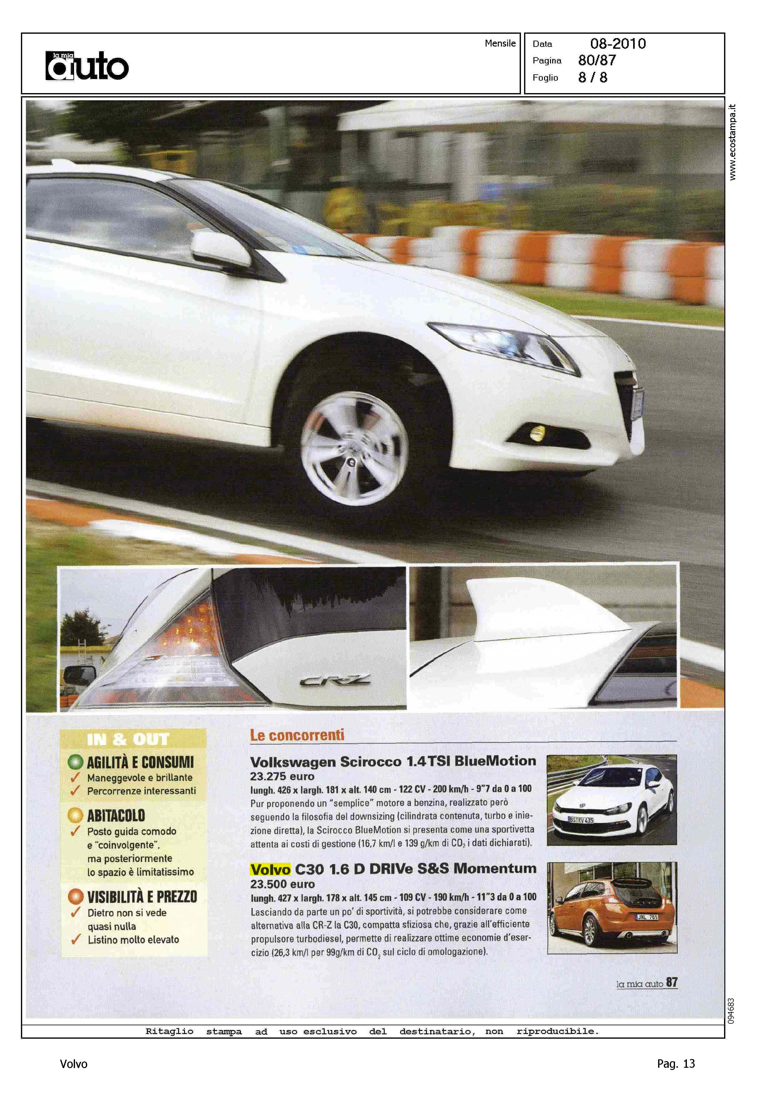 Highlight: COMPETITOR - VOLVO C30 1.6 D DRIVE S&S MOMENTUM CONCORRENTE VERSO VOLKWAGEN SCIROCCO 1.4 TSI BLUEMOTION, HONDA CR-Z GT PLUS I-PILOT - VOLVO, PREZZO, PRESTAZIONI, MISURE, MOTORE, ECONOMIA DI ESERCIZIO