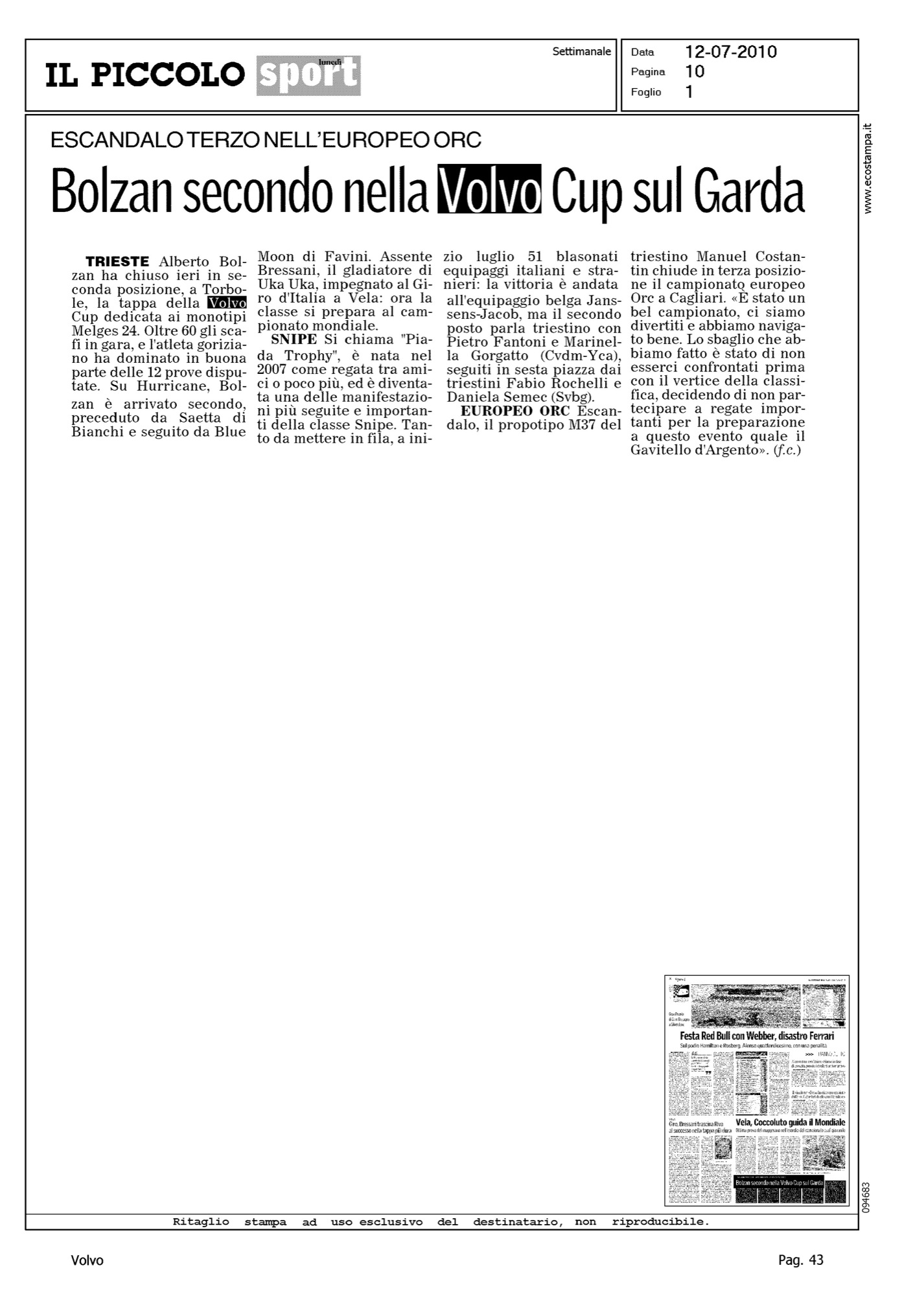Author: Line: Corporate Model: Corporate Subject: Volvo Cup Title: BOLZAN SECONDO NELLA VOLVO CUP SUL GARDAHighlight: REGATA DI TORBOLE