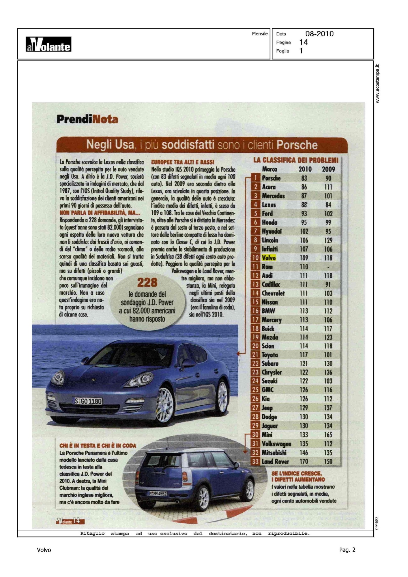 Author: Line: Corporate Model: Corporate Subject: - Title: NEGLI USA, I PIU' SODDISFATTI SONO I CLIENTI PORSCHEHighlight: CLASSIFICA JDPOWER MERCATO USA - VOLVO POSIZIONE, 10/33