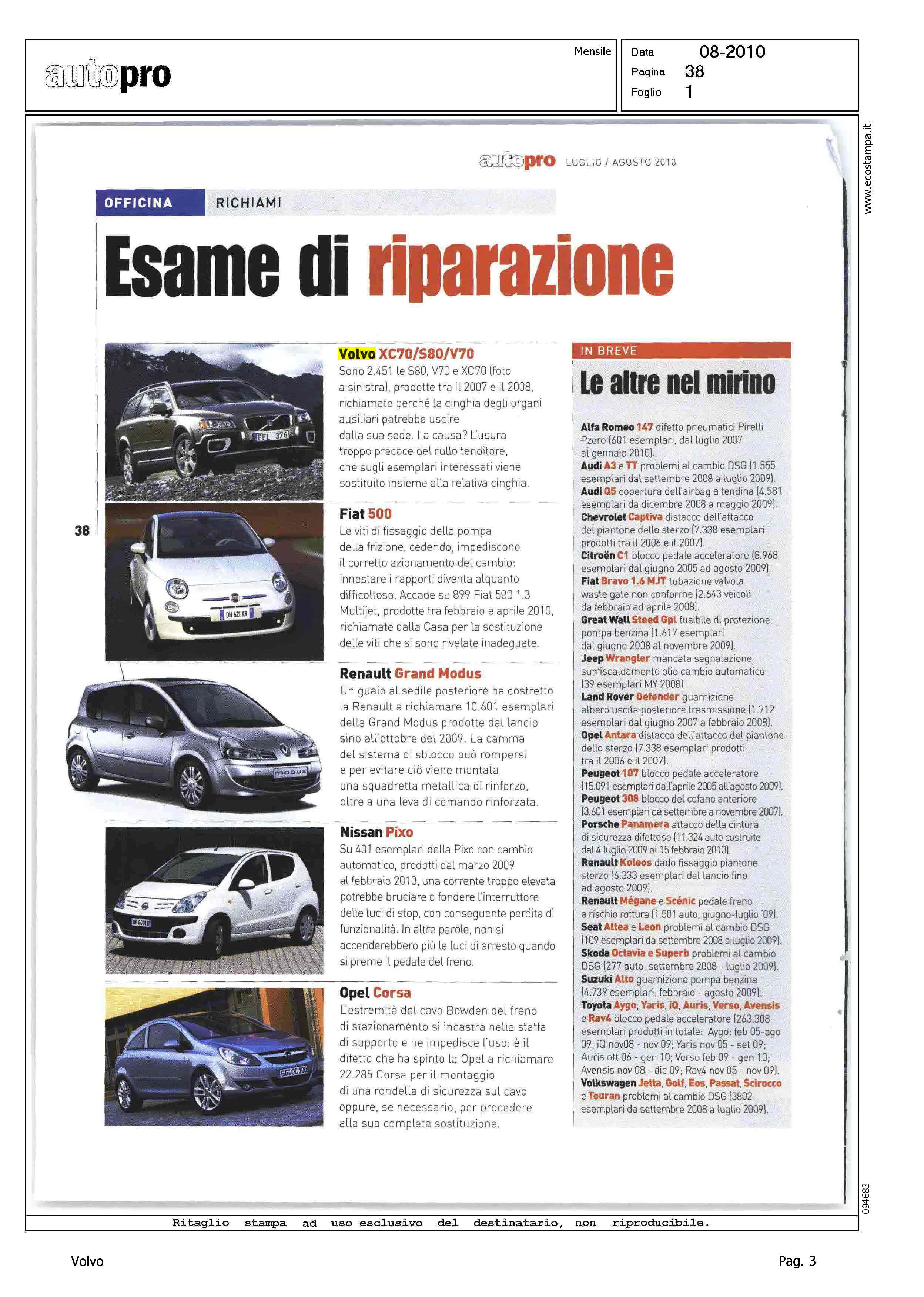 Author: Line: Corporate Model: Corporate Subject: - Title: ESAME DI RIPARAZIONEHighlight: RICHIAMO CINGHIA PER XC70, S80, V70