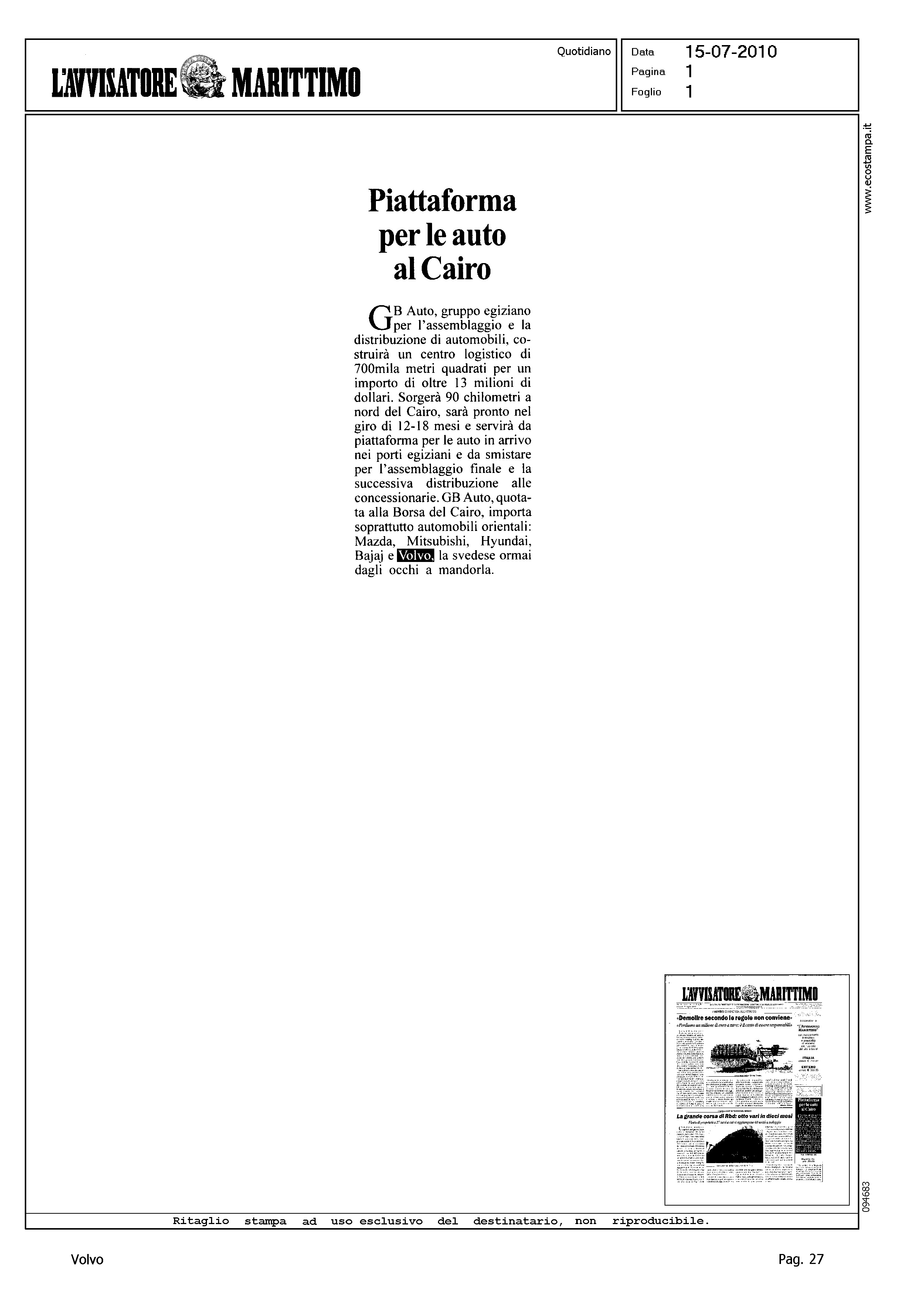 Author: Line: Corporate Model: Corporate Subject: - Title: PIATTAFORMA PER LE AUTO AL CAIROHighlight: GB AUTO, IL CAIRO