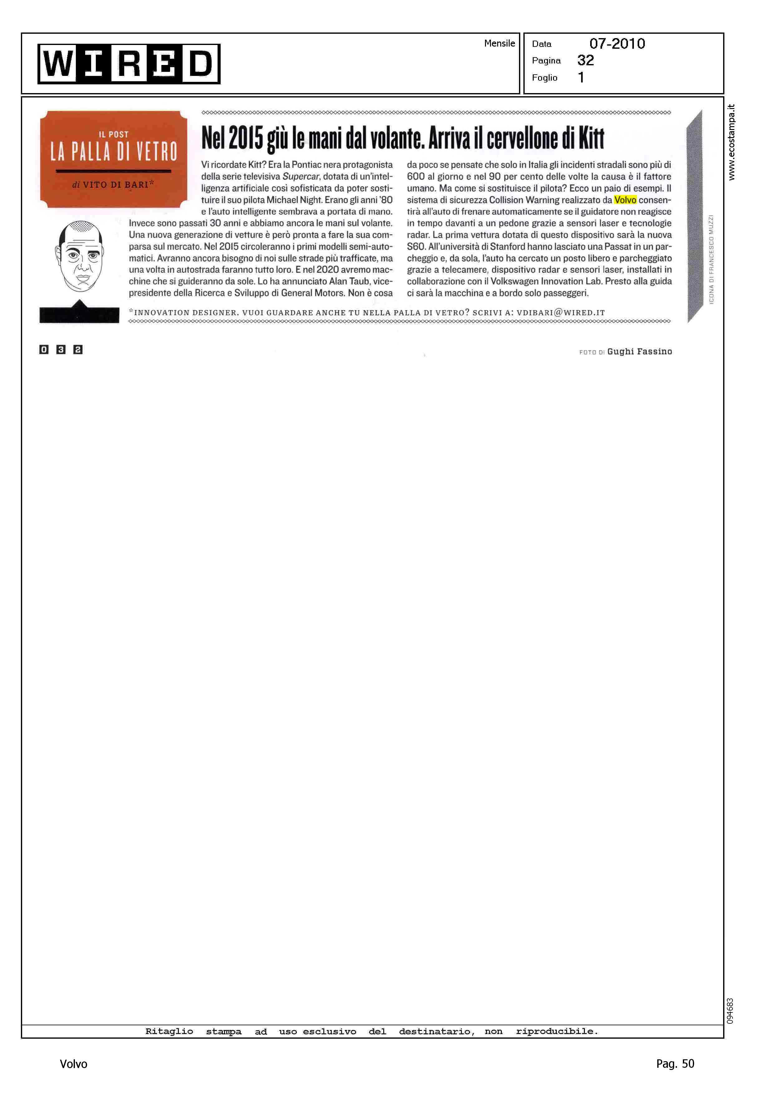 Author: DI BARI, VITOLine: Corporate Model: Corporate Subject: - Title: LA PALLA DI VETRO - NEL 2015 GIU' LE MANI DAL VOLANTE. ARRIVA IL CERVELLONE DI KITTHighlight: SICUREZZA - PEDESTRIAN DETECTION