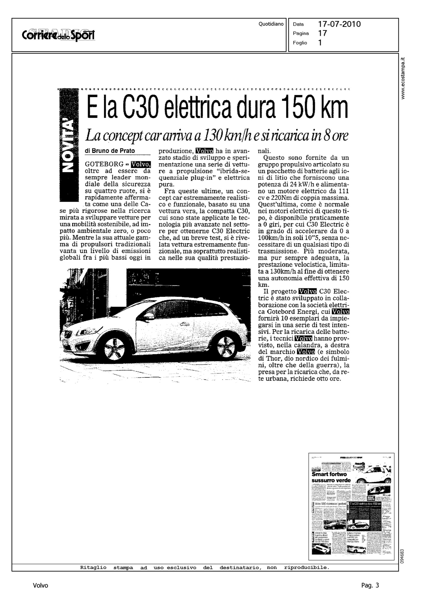 Highlight: VALORE VOLVO - LIVELLO EMISSIONI MOTORI VOLVO - SVILUPPO PROGETTI IBRIDA SEQUENZIALE PLUG.IN E ELETTRICA - PROGETTO VOLVO C30 ELETTRICA, "REALISTICA NELLE SUE QUALITA' PRESTAZIONALI" - BATTERIE IONI DI LITIO - VALORI CV E COPPIA - PRESTAZIONI, VELOCITA' MASSIMA ED ACCELERAZIONE - AUTONOMIA - GOTEBORG ENERGI - TEMPO DI RICARICA
