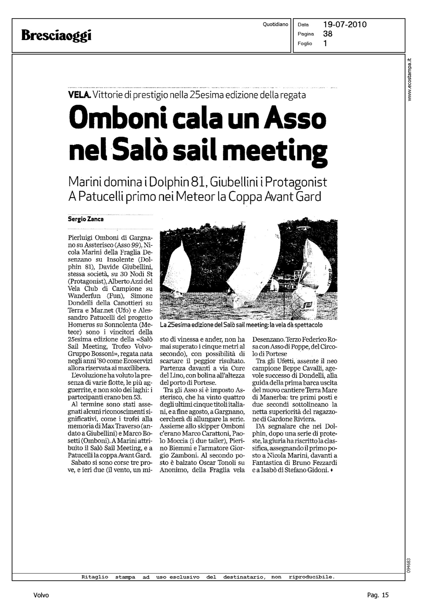 Author: ZANCA, SERGIOLine: Corporate Model: Corporate Subject: Volvo Cup Title: OMBONI CALA UN ASSO NEL SALO' SAIL MEETINGHighlight: REGATA SALO' SAIL MEETING TROFEO VOLVO GRUPPO BOSSONI