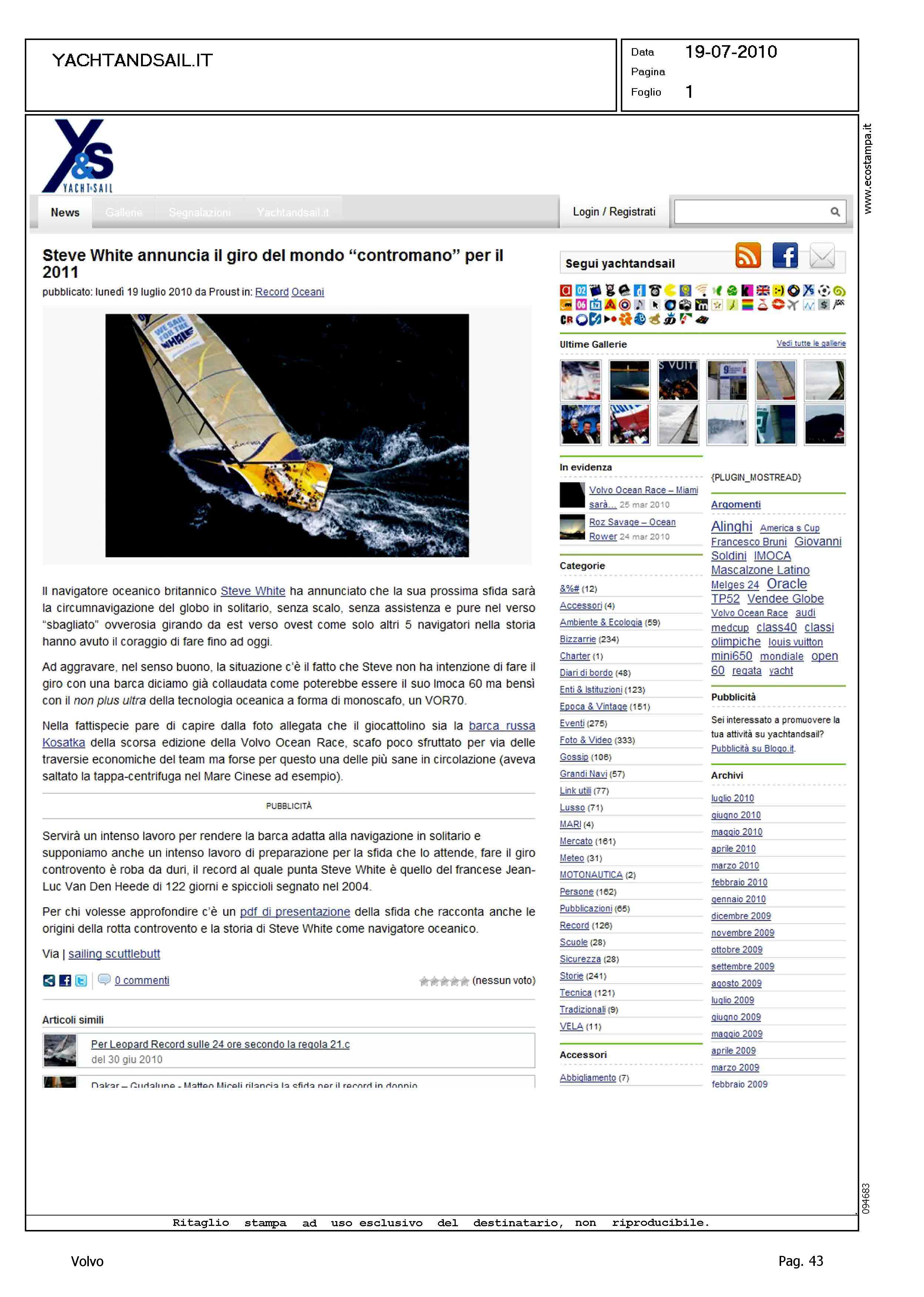 Author: Line: Corporate Model: Corporate Subject: Volvo Ocean Race Title: STEVE WHITE ANNUNCIA IL GIRO DEL MONDO "CONTROMANO" PER IL 2011Highlight: CLASSE VOR70 PER GIRO MONDO IN SENSO INVERSO
