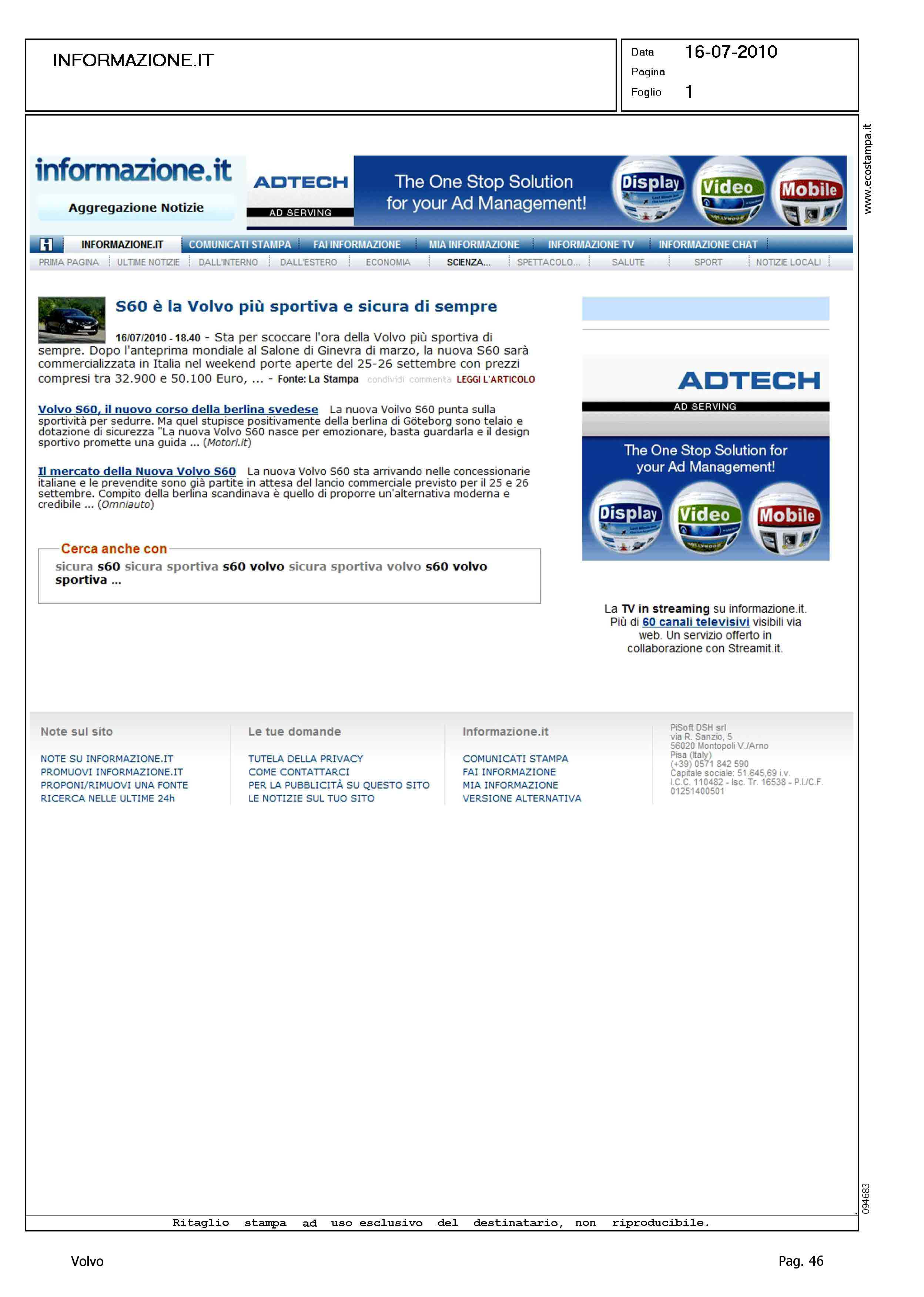 Author: Line: S60 Model: Linea S60 Testdrive Subject: - Title: AGGREGATORE DI NOTIZIE ON LINE - TITOLI VARI - TRE SEGNALAZIONIHighlight: AGGREGATORE DI NOTIZIE ON LINE - 3 POSIZIONI SEGNALATE RELATIVE A VOLVO S60