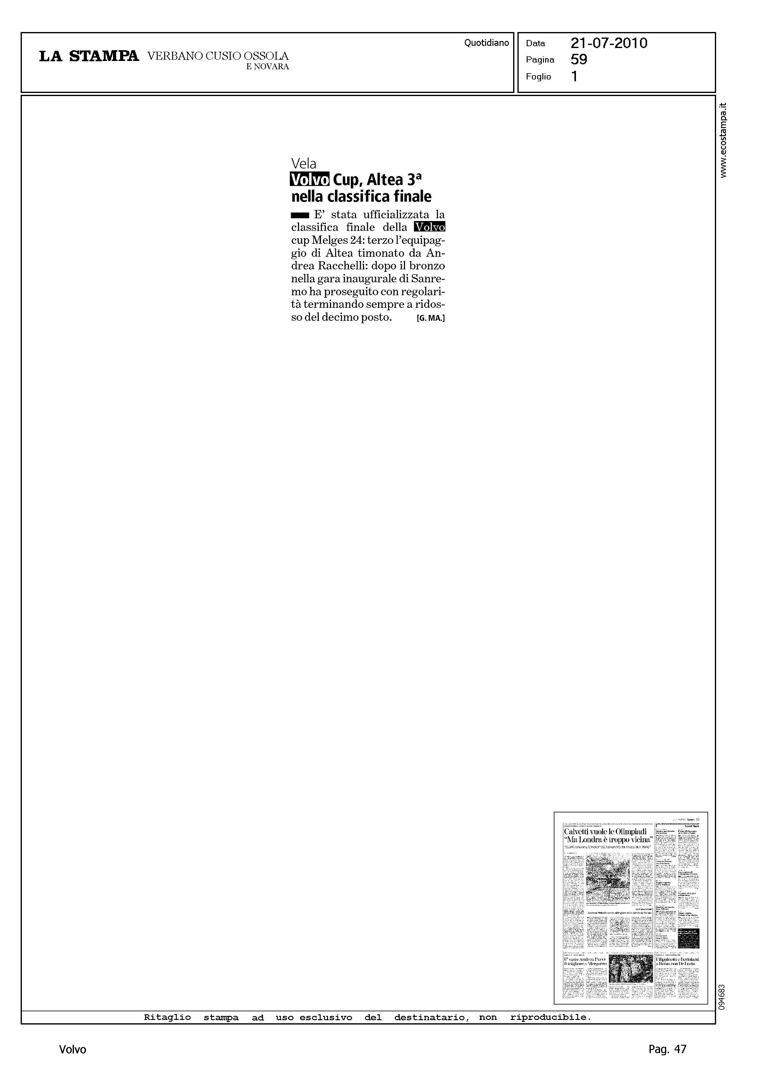 Author: Line: Corporate Model: Corporate Subject: Volvo Cup Title: VELA - VOLVO CUP, ALTEA 3a NELLA CLASSIFICA FINALEHighlight: (EDIZIONE VERBANO, CUSIO, OSSOLA, NOVARA) - ALTEA