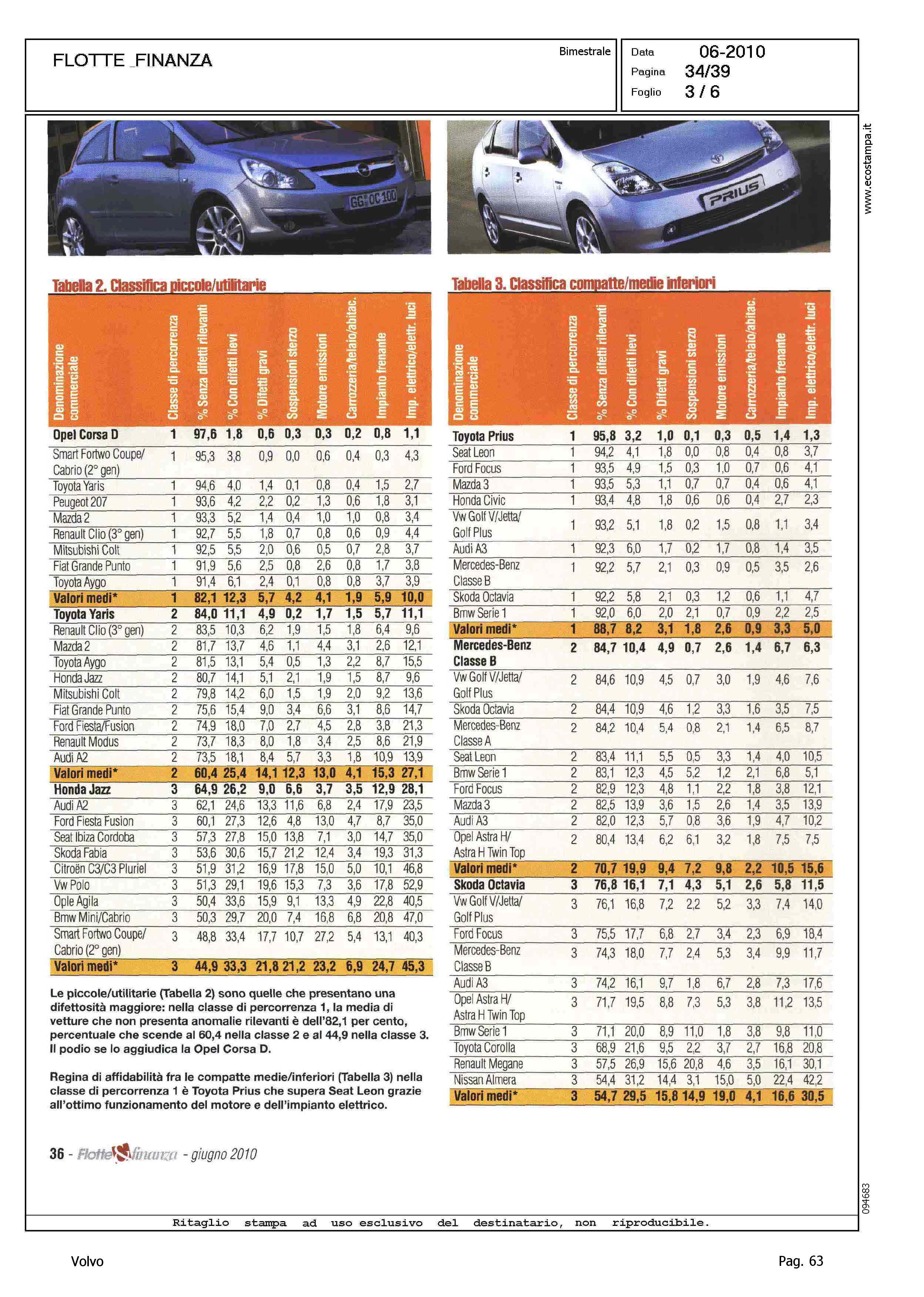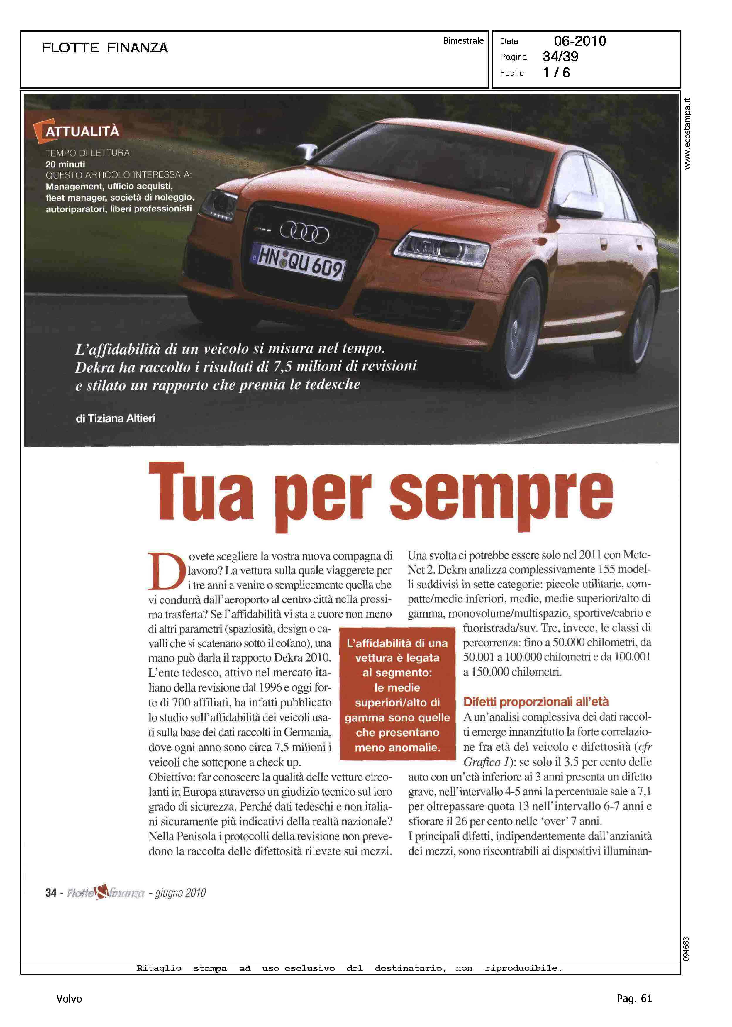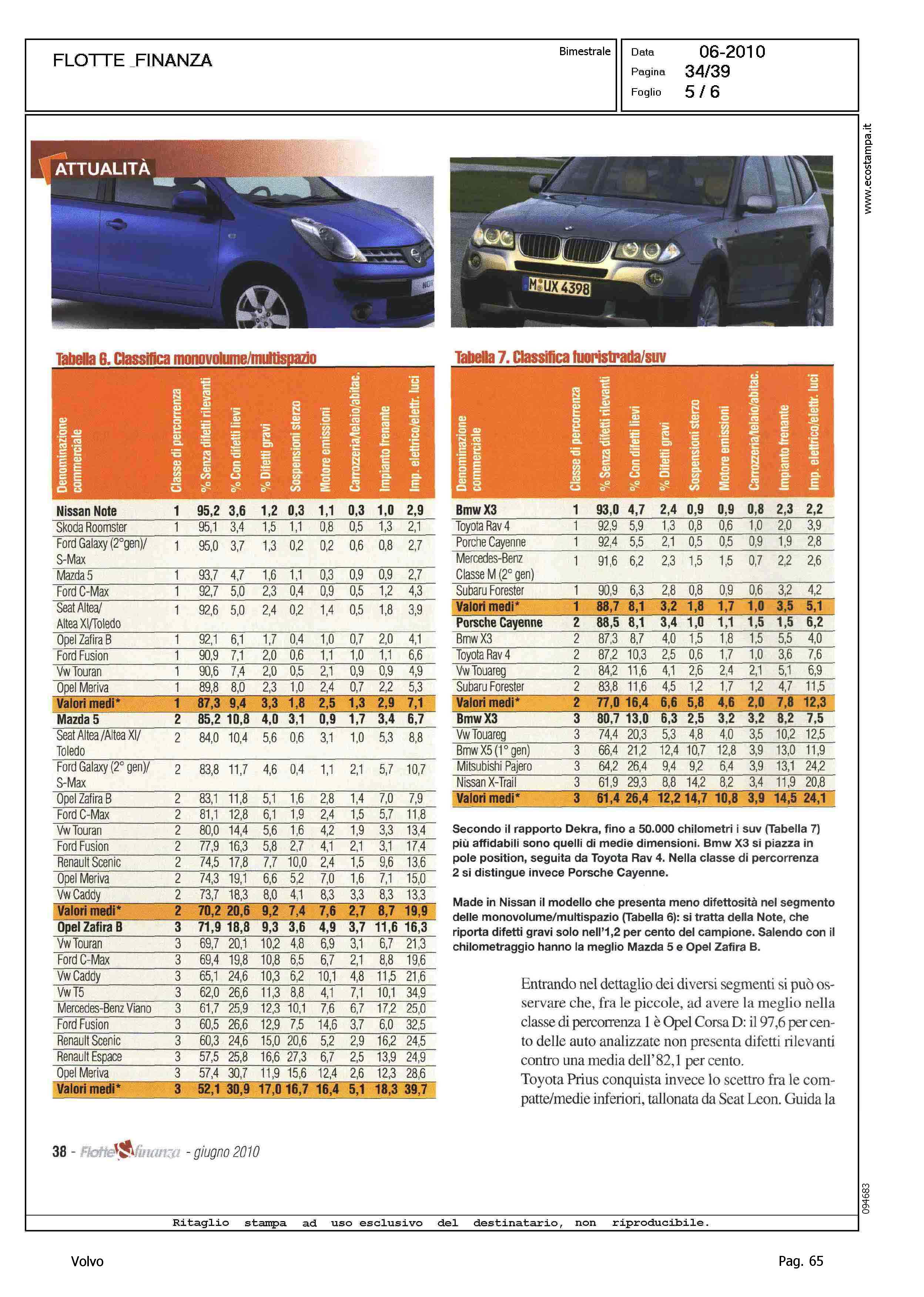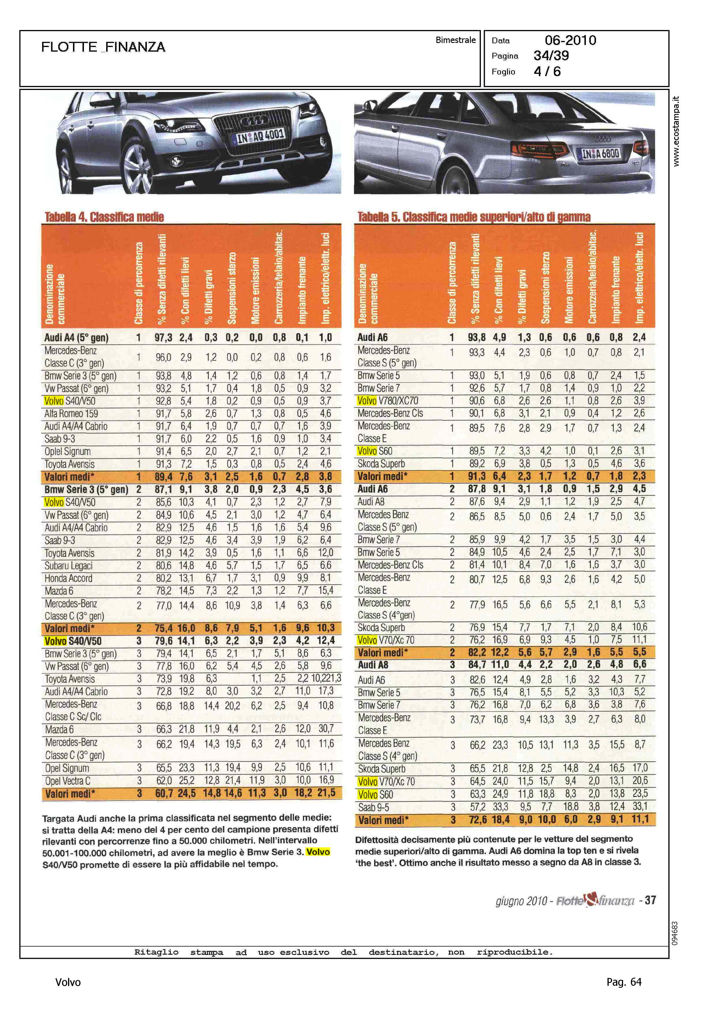Highlight: INDICE DI DIFETTOSITA' PER MODELLO - TABELLA 1, LA MIGLIORE DI TUTTE LE CLASSI, VOLVO S40/V50, SEGMENTO 3, MEDIA SENZA DIFETTI RILEVANTI 86%, 4/10 - TABELLA 4 E 5, VOLVO S40/V50, VOLVO V70, XC70, S60, VALORI MEDI E ASSOLUTI, VEDI TABELLA