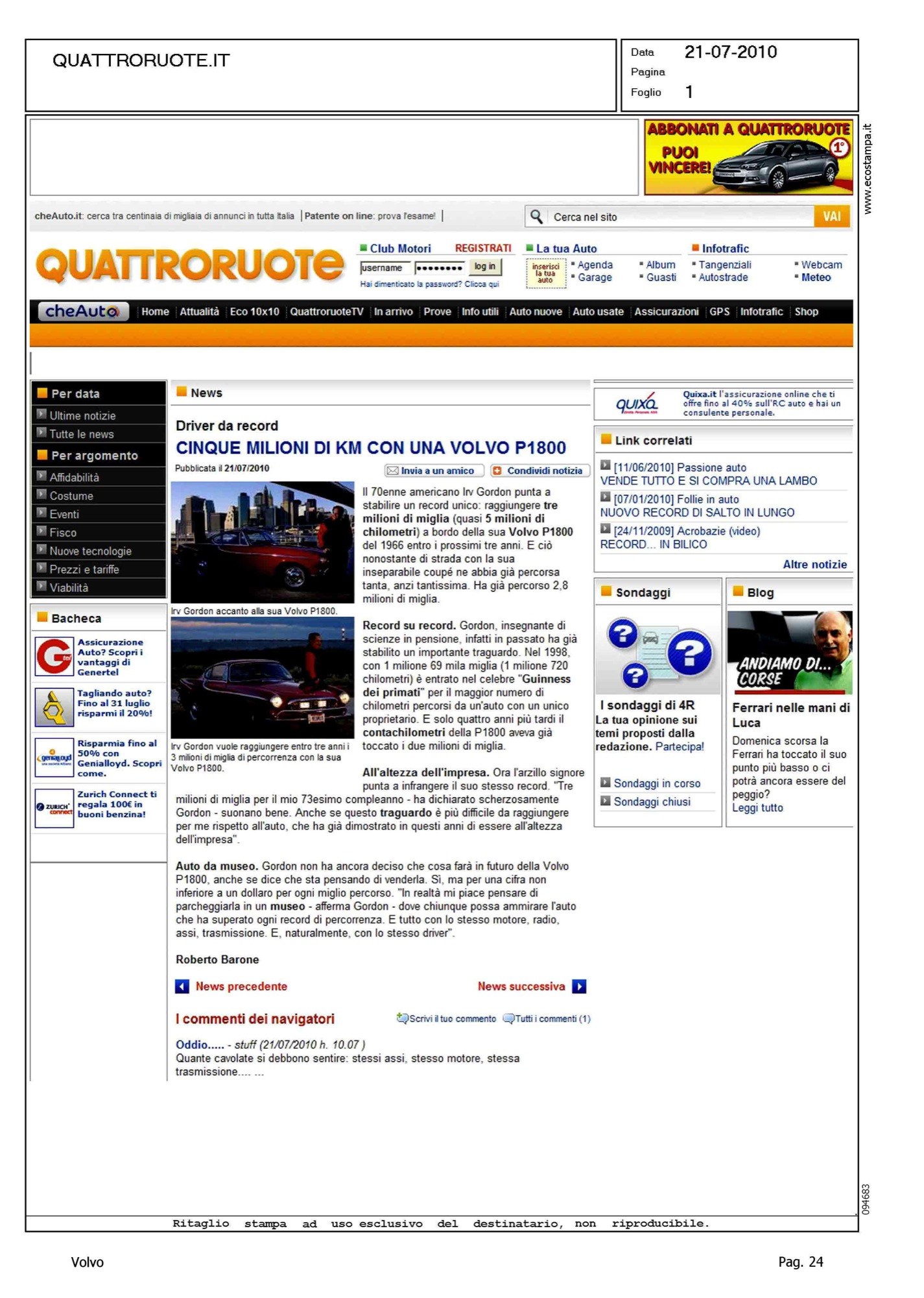 Author: Line: Corporate Model: Corporate Subject: - Title: CINQUE MILIONI DI KM CON UNA VOLVO P1800Highlight: 4,5 MILIONI DI KM