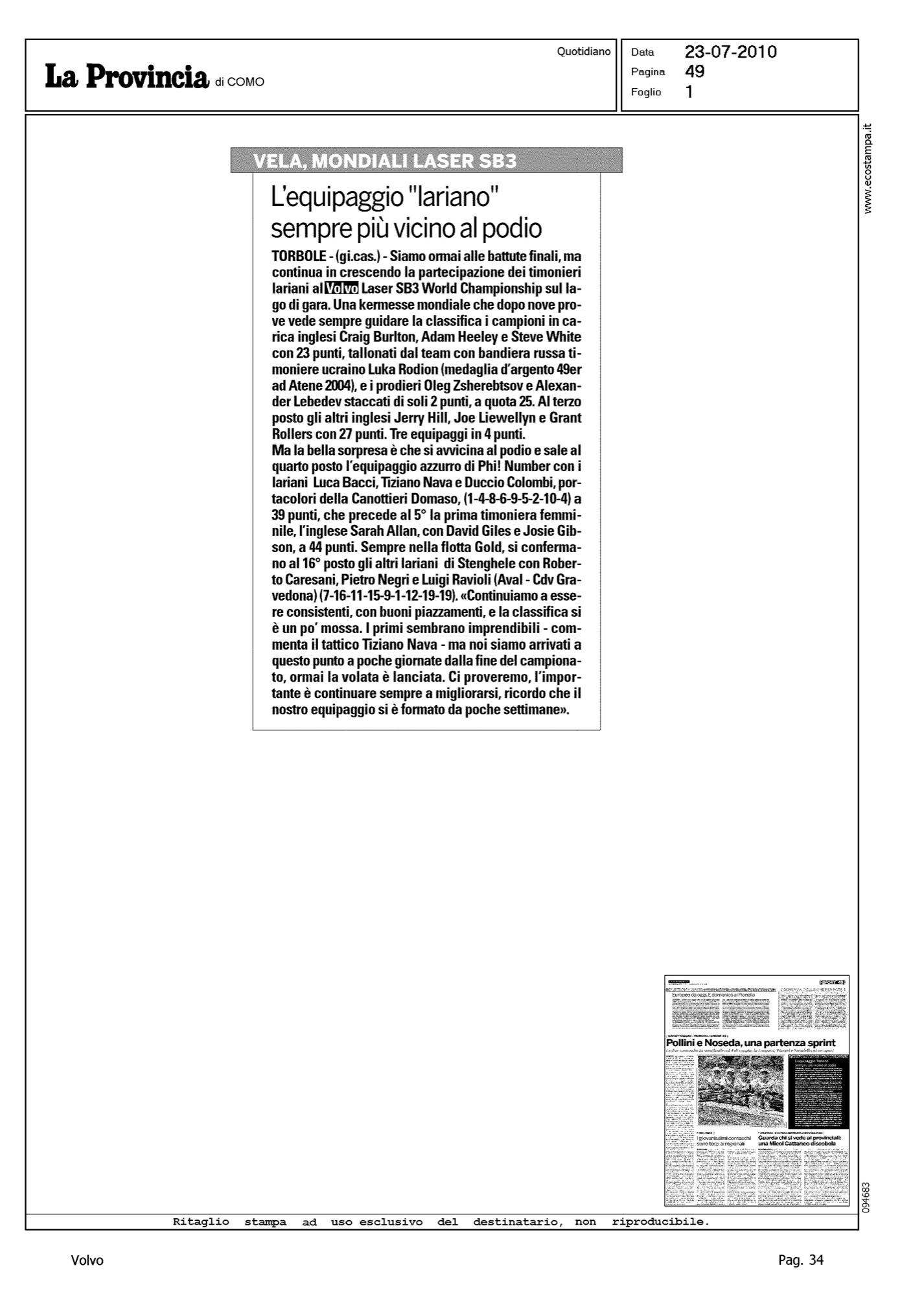 Author: Line: Corporate Model: Corporate Subject: Volvo Cup Title: VELA. MONDIALI LASER SB3 - L'EQUIPAGGIO "LARIANO" SEMPRE PIU' VICINO AL PODIOHighlight: REGATA TORBOLE, MONDIALE