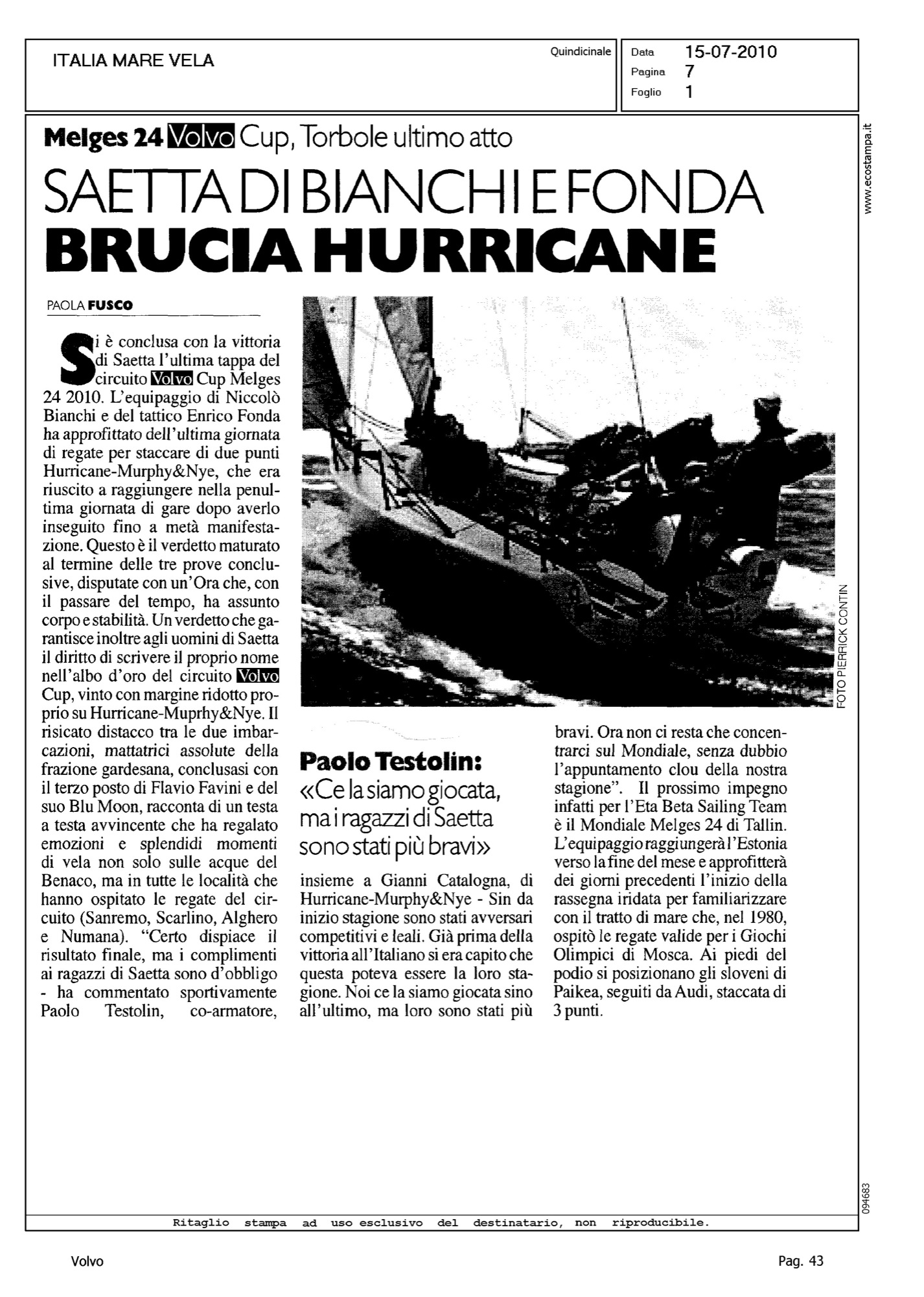 Author: FUSCO, PAOLALine: Corporate Model: Corporate Subject: Volvo Cup Title: SAETTA DI BIANCHI E FONDA BRUCIA HURRICANEHighlight: REGATA TORBOLE