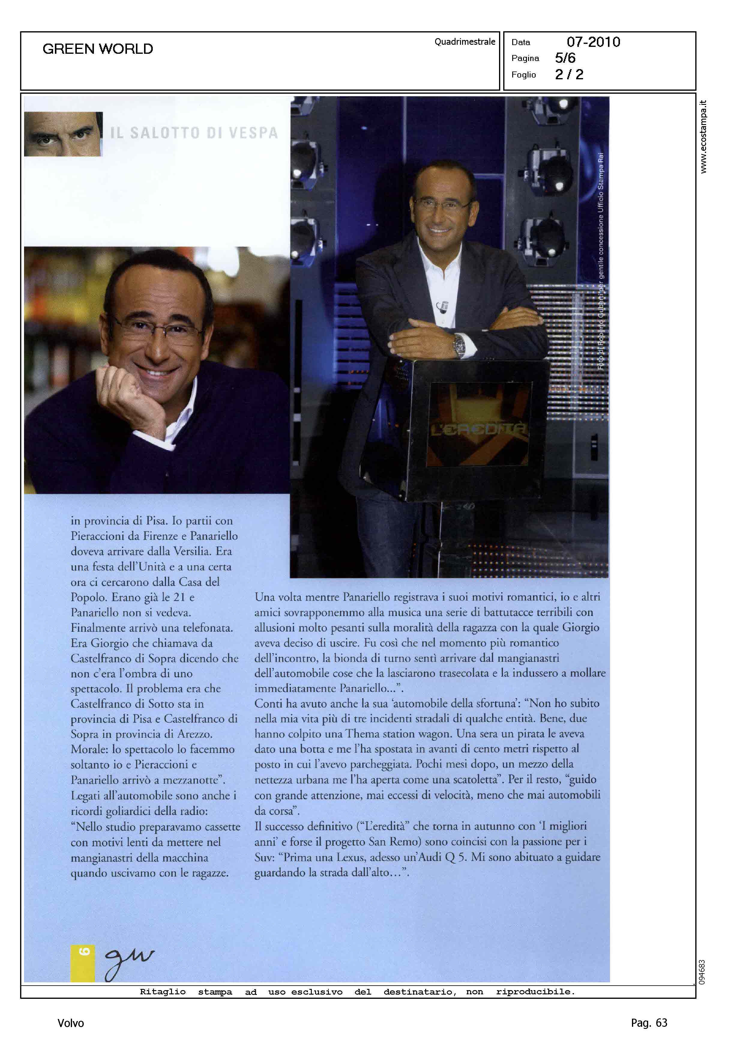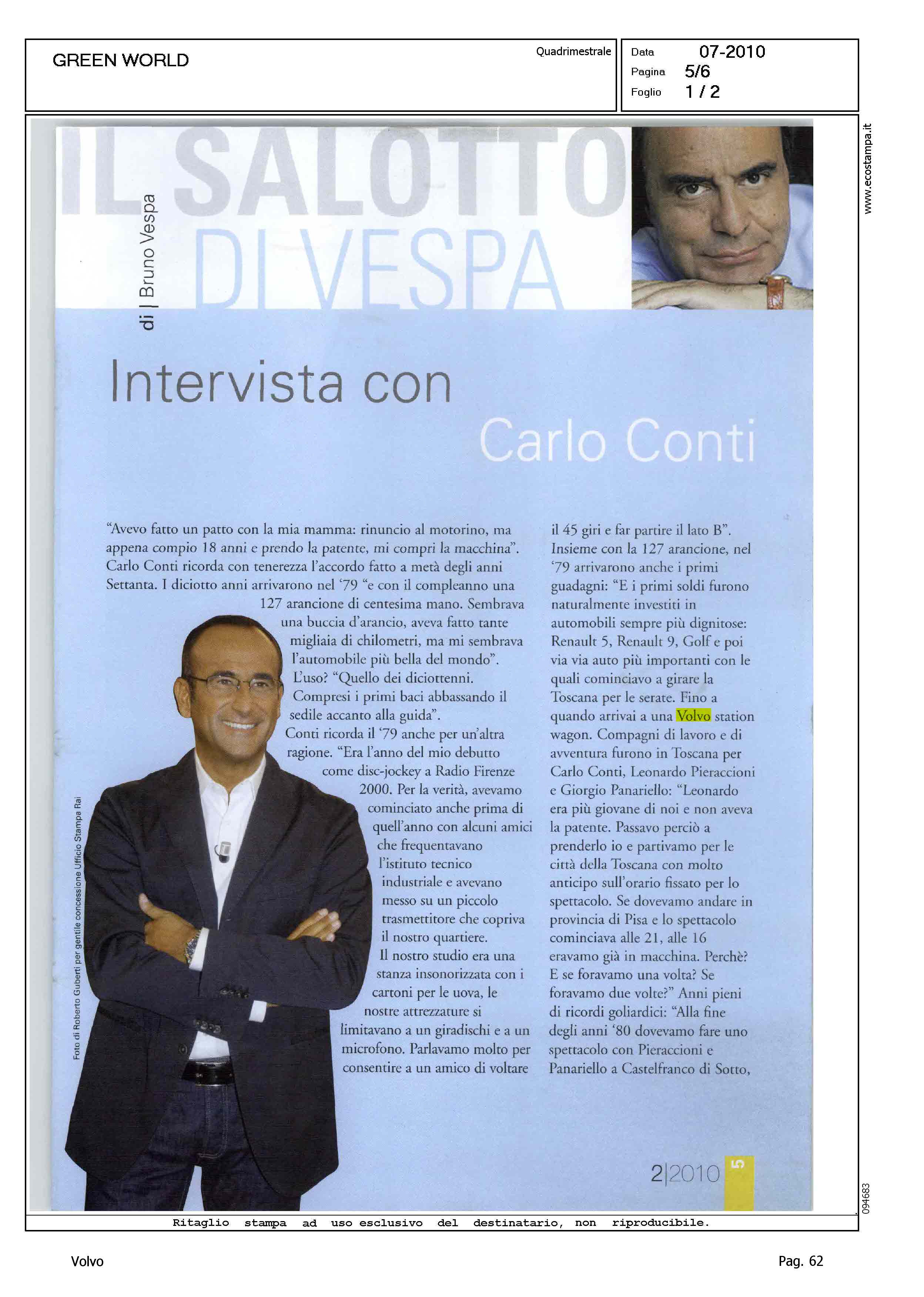 Author: VESPA, BRUNOLine: Corporate Model: Corporate Subject: - Title: IL SALOTTO DI VESPA - INTERVISTA CON CARLO CONTIHighlight: BRUNO VESPA INTERVISTA CARLO CONTI - CITAZIONE VOLVO TRA LE AUTOMOBILI DI CARLO CONTI