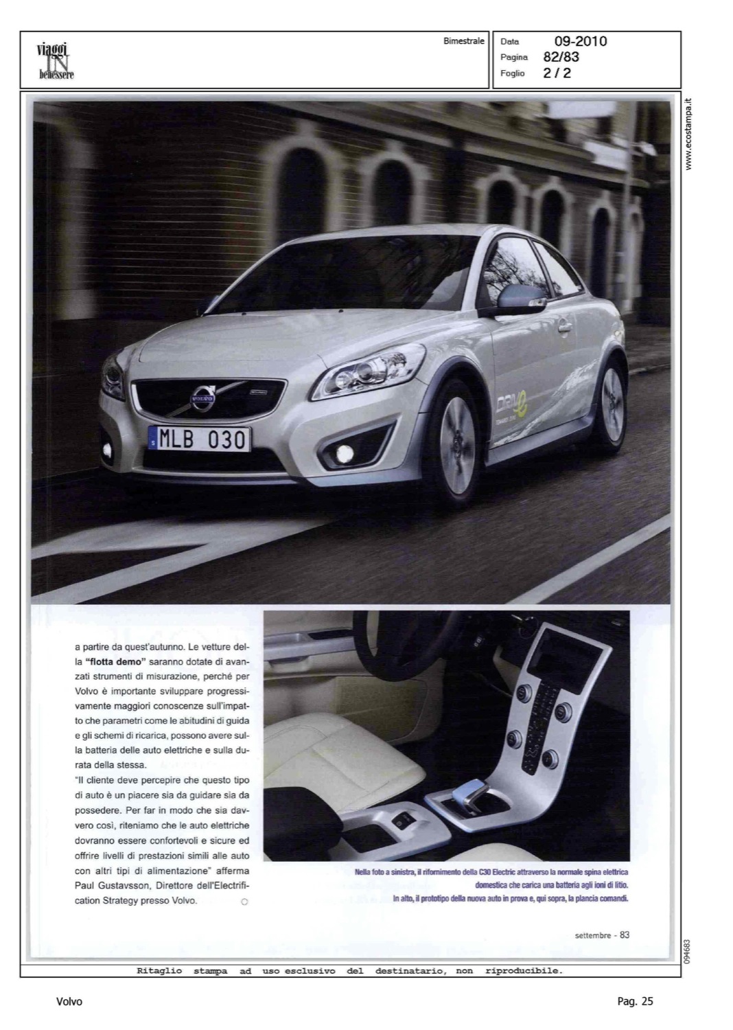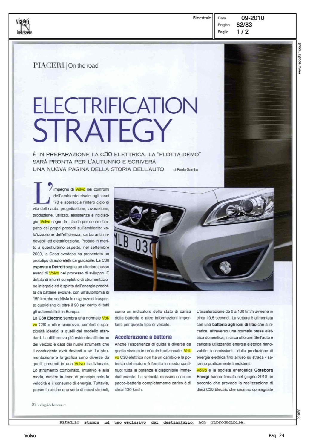 Highlight: VALORE VOLVO - AMBIENTE - PROFILO PRODOTTO - ARCHITETTURA PROGETTO - ABITACOLO - STRUMENTAZIONE - DINAMICA DI MARCIA - PRESTAZIONI - BATTERIA LITIO - TEMPO RICARICA - GOTEBORG ENERGI - FLOTTA DEMO - GUSTAVSSON SU C30 BEV