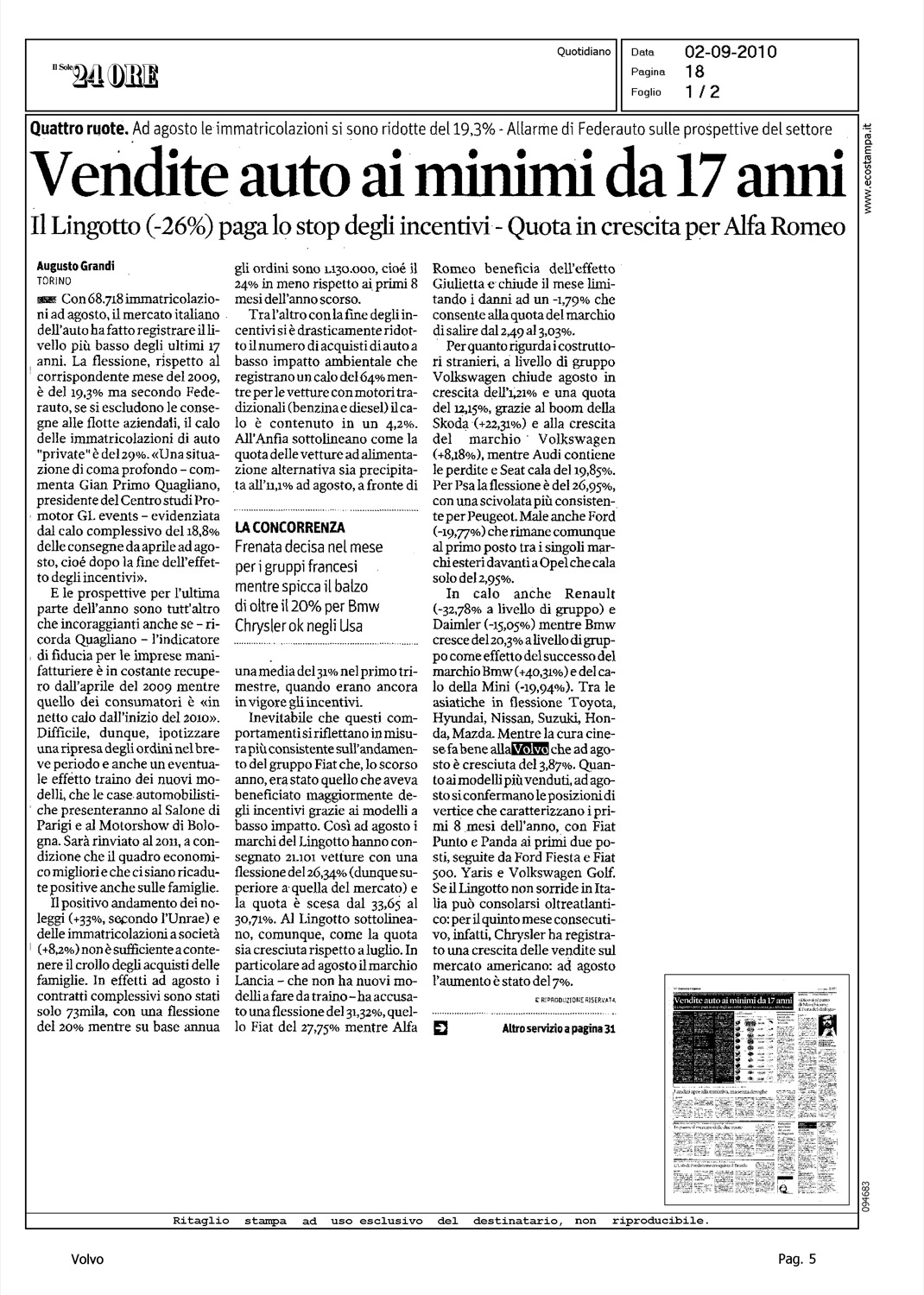 Author: GRANDI, AUGUSTOLine: Corporate Model: Corporate Subject: - Title: VENDITE AUTO AI MINIMI DA 17 ANNIHighlight: CONSUNTIVO AGOSTO