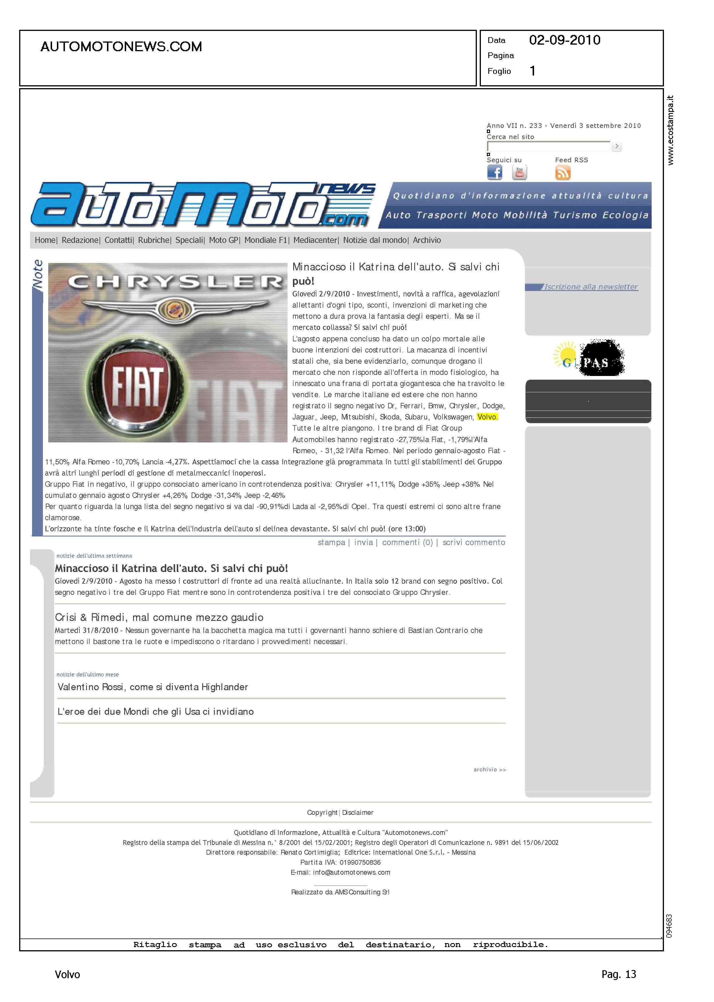 Author: Line: Corporate Model: Corporate Subject: - Title: MINACCIOSO IL KATRINA DELL'AUTO - SI SALVI CHI PUO'!Highlight: CONSUNTIVO AGOSTO MERCATO ITALIA