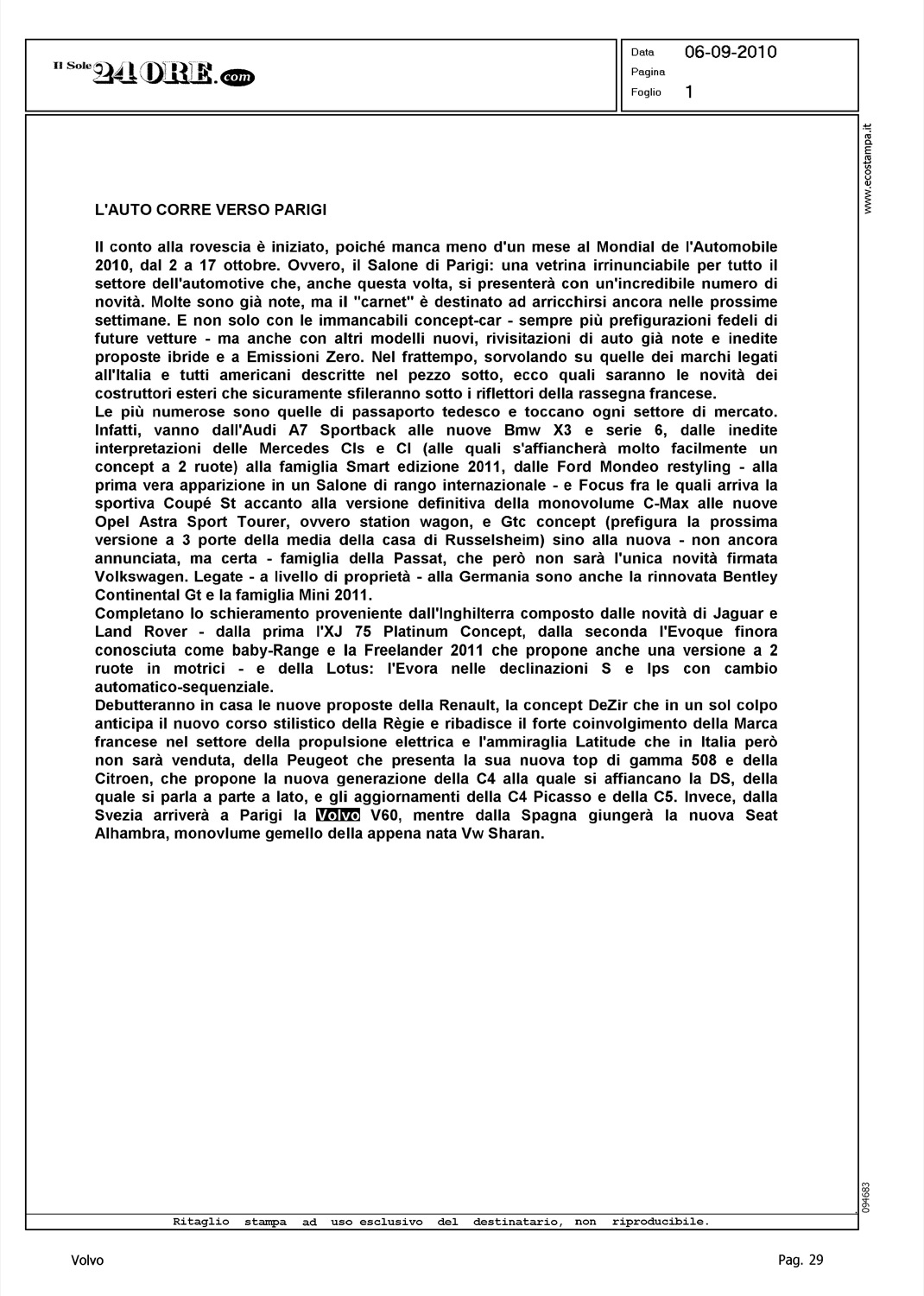 Author: Line: Corporate Model: Corporate Subject: - Title: L'AUTO CORRE VERSO PARIGIHighlight: PARIGI - V60 UNVEILING