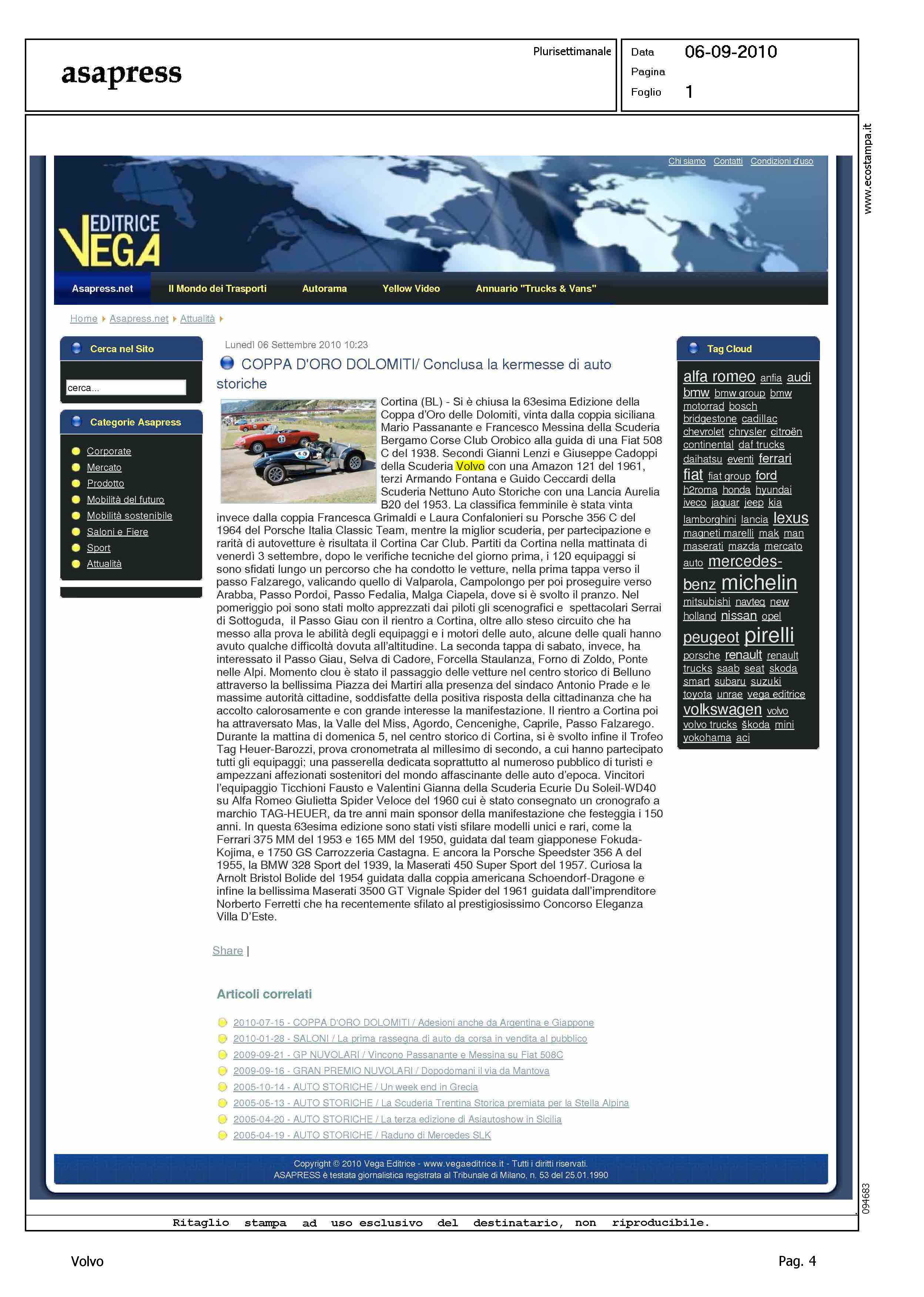 Author: Line: Corporate Model: Corporate Subject: - Title: COPPA D'ORO DOLOMITI - CONCLUSA LA KERMESSE DI AUTO STORICHEHighlight: SCUDERIA VOLVO