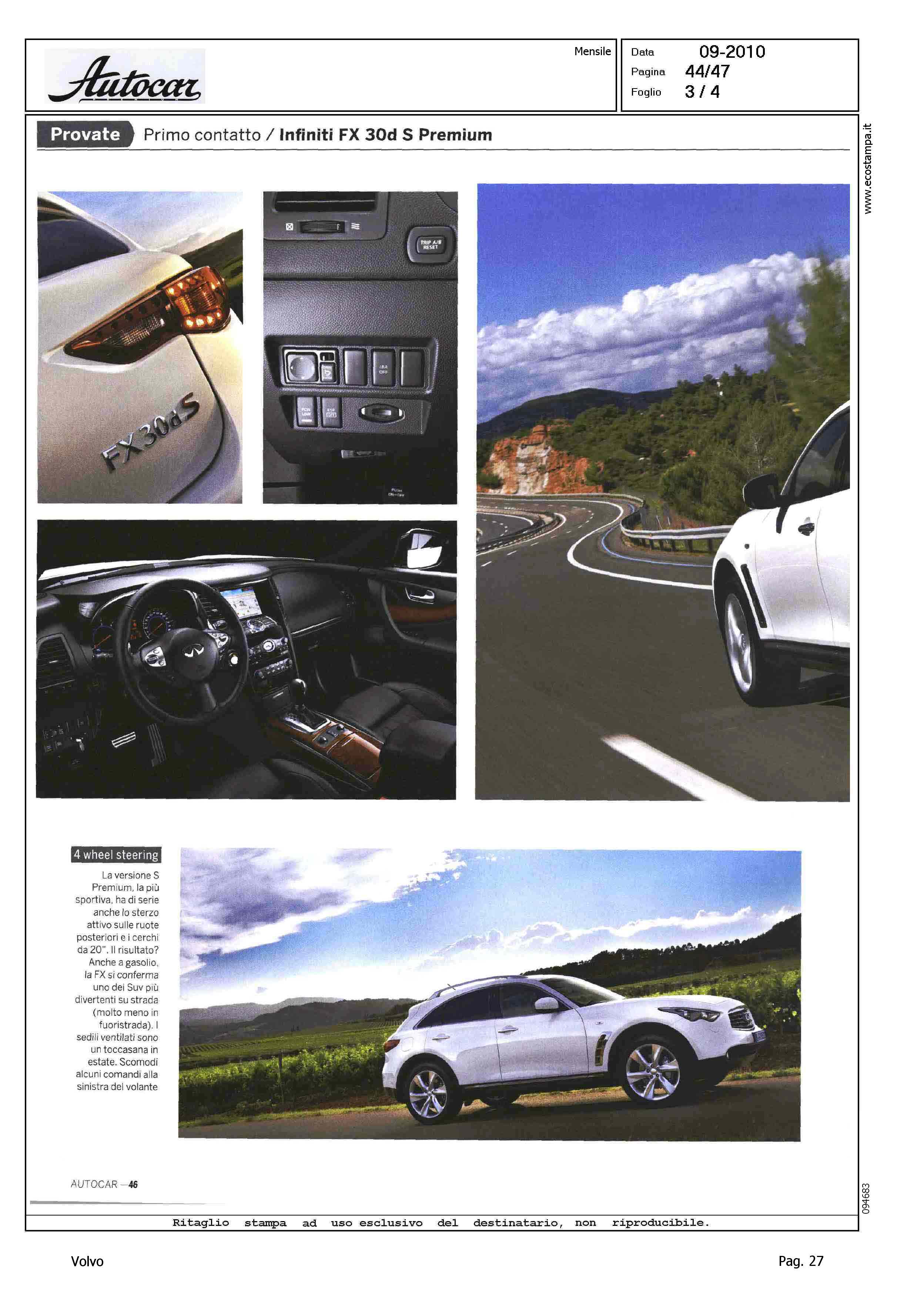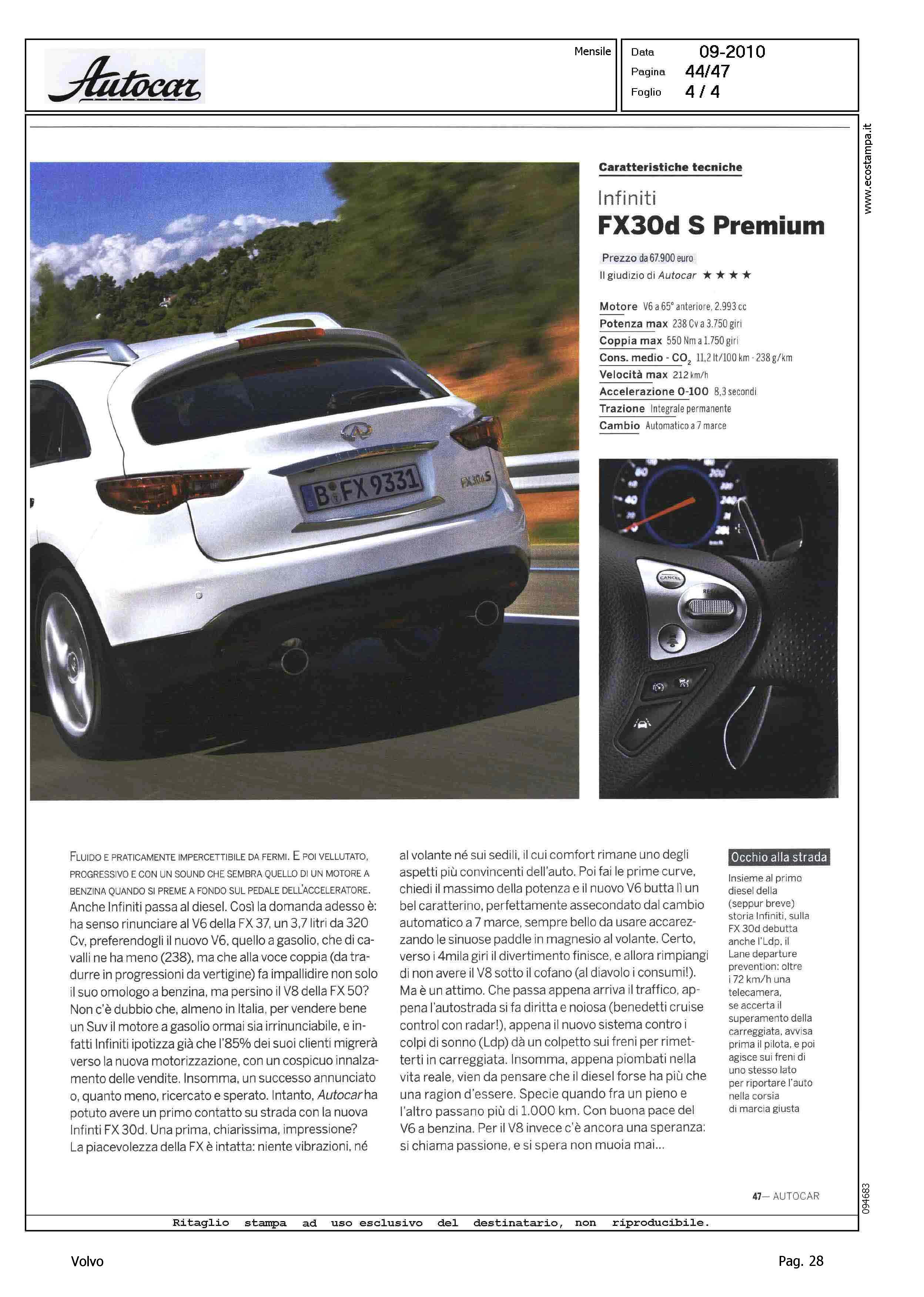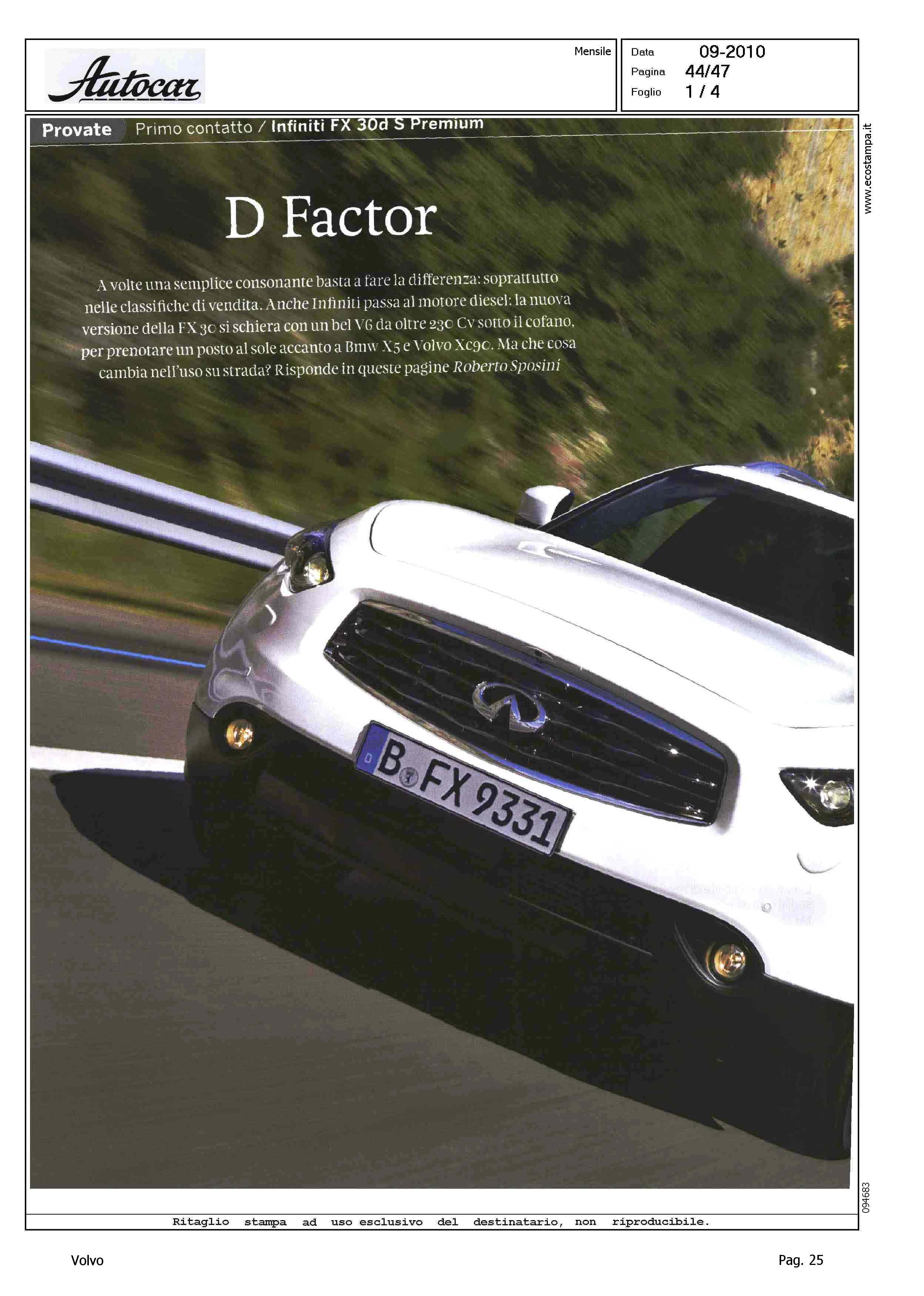 Author: SPOSINI, ROBERTOLine: Corporate Model: Volvo XC90 Subject: - Title: PROVATE - D FACTORHighlight: COMPETITOR VOLVO XC90 VS INFINITI FX 3.0D S PREMIUM, CITAZIONE IN OCCHIELLO APERTURA ARTICOLO, BMW X5